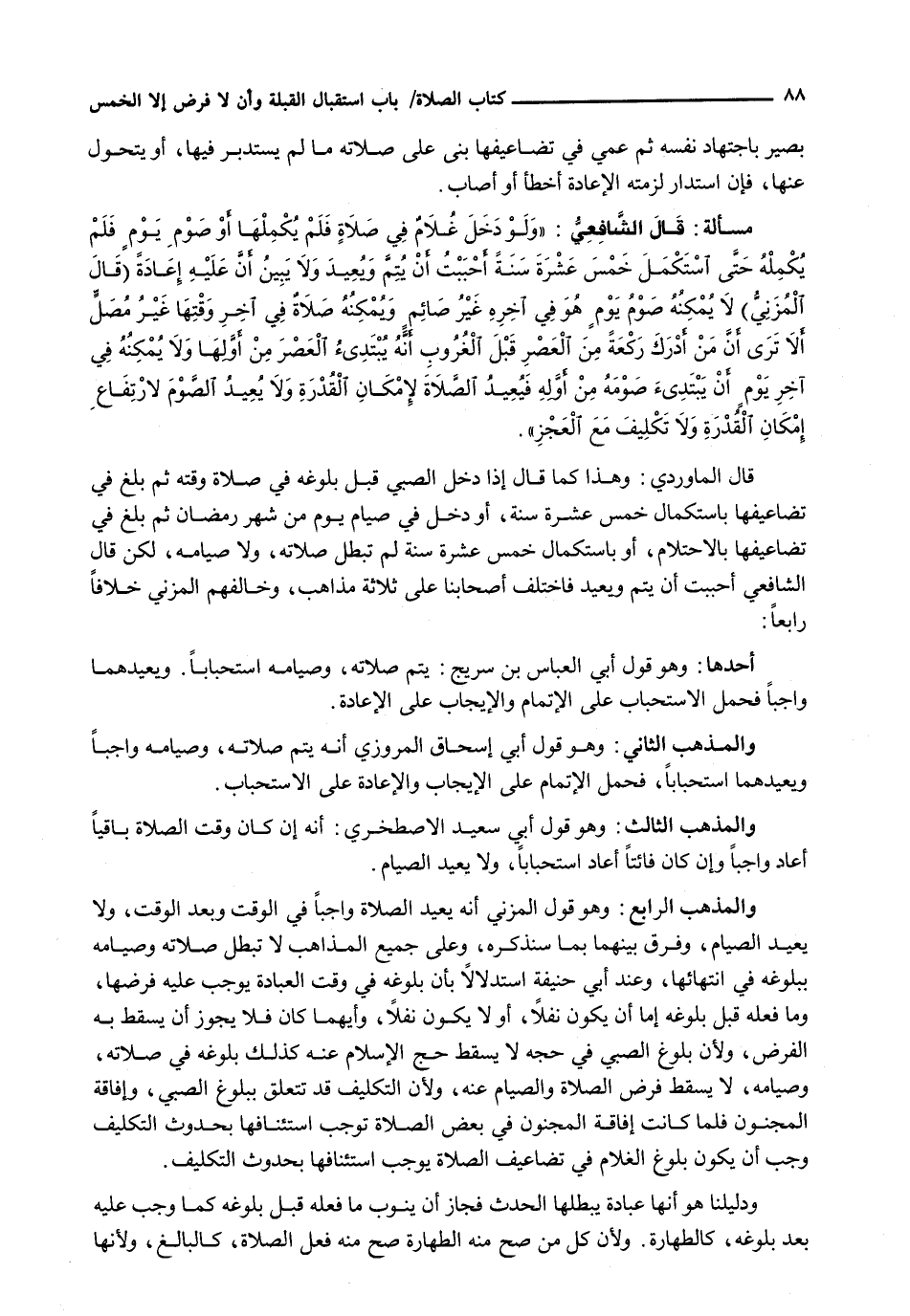 قَالَ الْمَاوَرْدِيُّ: وَهَذَا كَمَا قَالَ إِذَا دَخَلَ الصَّبِيُّ قَبْلَ بُلُوغِهِ فِي صَلَاةِ وَقْتِهِ ثُمَّ بلغ في تضاعيفها باستكمال خمس عشر سَنَةً، أَوْ دَخَلَ فِي صِيَامِ يَوْمٍ مِنْ شَهْرِ رَمَضَانَ ثُمَّ بَلَغَ فِي تَضَاعِيفِهَا بِالِاحْتِلَامِ، أو باستكمال خمس عشر سَنَةً لَمْ تَبْطُلْ صَلَاتُهُ، وَلَا صِيَامُهُ، لَكِنْ قَالَ الشَّافِعِيُّ أَحْبَبْتُ أَنْ يُتِمَّ وَيُعِيدَ فَاخْتَلَفَ أَصْحَابُنَا عَلَى ثَلَاثَةِ مَذَاهِبَ، وَخَالَفَهُمُ الْمُزَنِيُّ خِلَافًا رابعاً: