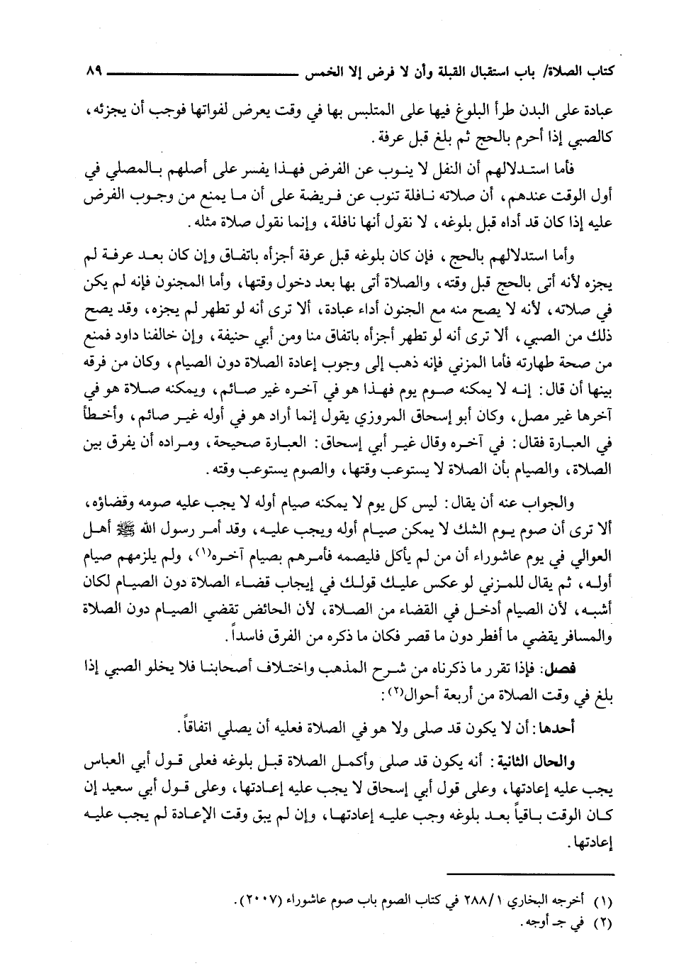 وَأَمَّا اسْتِدْلَالُهُمْ بِالْحَجِّ، فَإِنْ كَانَ بُلُوغُهُ قَبْلَ عَرَفَةَ أَجْزَأَهُ بِاتِّفَاقٍ وَإِنْ كَانَ بَعْدَ عَرَفَةَ لَمْ يُجْزِهِ لِأَنَّهُ أَتَى بِالْحَجِّ قَبْلَ وَقْتِهِ، وَالصَّلَاةُ أَتَى بِهَا بَعْدَ دُخُولِ وَقْتِهَا، وَأَمَّا الْمَجْنُونُ فَإِنَّهُ لَمْ يَكُنْ فِي صَلَاتِهِ، لِأَنَّهُ لَا يصح منه مع المجنون أَدَاءُ عِبَادَةٍ، أَلَا تَرَى أَنَّهُ لَوْ تَطَهَّرَ لم يجزه، وقد يصح ذلك من الصبي، ألا ترى أنه لو أَجْزَأَهُ بِاتِّفَاقٍ مِنَّا وَمِنْ أبي حنيفة، وَإِنْ خالفنا داود فمنع من صحة طهارته فَأَمَّا الْمُزَنِيُّ فَإِنَّهُ ذَهَبَ إِلَى وُجُوبِ إِعَادَةِ الصلاة دون الصيام، وكان من فرقه بينها أَنْ قَالَ: إِنَّهُ لَا يُمْكِنُهُ صَوْمُ يَوْمٍ فَهَذَا هُوَ فِي آخِرِهِ غَيْرُ صَائِمٍ، وَيُمْكِنُهُ صَلَاةٌ هُوَ فِي آخِرِهَا غَيْرُ مُصَلٍّ، وَكَانَ أَبُو إِسْحَاقَ الْمَرْوَزِيُّ يَقُولُ إِنَّمَا أَرَادَ هُوَ فِي أَوَّلِهِ غَيْرُ صَائِمٍ، وَأَخْطَأَ فِي الْعِبَارَةِ فَقَالَ: فِي آخِرِهِ وَقَالَ غَيْرُ أَبِي إِسْحَاقَ: الْعِبَارَةُ صَحِيحَةٌ، وَمُرَادُهُ أَنْ يُفَرِّقَ بَيْنَ الصَّلَاةِ، وَالصِّيَامِ بِأَنَّ الصَّلَاةَ لَا يُسْتَوْعَبُ وَقْتُهَا، وَالصَّوْمَ يُسْتَوْعَبُ وَقْتُهُ