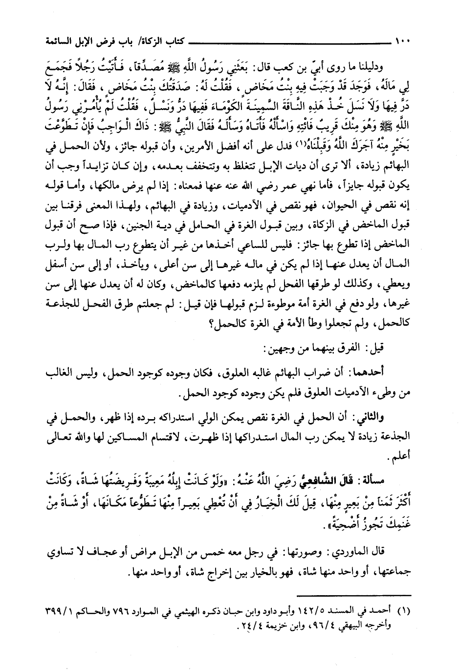 وَدَلِيلُنَا مَا رَوَى أُبَيُّ بْنُ كَعْبٍ قَالَ: بَعَثَنِي رَسُولُ اللَّهِ - صَلَّى اللَّهُ عَلَيْهِ وَسَلَّم َ - مُصَدِّقًا، فَأَتَيْتُ رَجُلًا فَجَمَعَ لِي مَالَهُ، فَوَجَدَ قَدْ وَجَبَتْ فِيهِ بِنْتُ مَخَاضٍ، فَقُلْتُ لَهُ: صَدَقَتُكَ بِنْتُ مَخَاضٍ، فَقَالَ: إِنَّهُ لَا دَرَّ فِيهَا وَلَا نَسْلَ خُذْ هَذِهِ النَّاقَةَ السَّمِينَةَ الْكَوْمَاءَ فَفِيهَا دَرٌّ وَنَسْلٌ، فَقُلْتُ لَمْ يَأْمُرْنِي رسول الله - صَلَّى اللَّهُ عَلَيْهِ وَسَلَّم َ - وَهُوَ مِنْكَ قَرِيبٌ فَائْتِهِ وَاسْأَلْهُ فَأَتَاهُ وَسَأَلَهُ فقال النبي - صَلَّى اللَّهُ عَلَيْهِ وَسَلَّم َ -: ذَاكَ الْوَاجِبُ فَإِنْ تَطَوَّعْتَ بَخَيْرٍ مِنْهُ آجَرَكَ اللَّهُ وَقَبِلْنَاهُ فَدَلَّ عَلَى أَنَّهُ أَفْضَلُ الْأَمْرَيْنِ، وَأَنَّ قَبُولَهُ جَائِزٌ، وَلِأَنَّ الْحَمْلَ فِي الْبَهَائِمِ زِيَادَةٌ، أَلَا تَرَى أَنَّ دِيَاتِ الْإِبِلِ تَتَغَلَّظُ به وتتخفف بعدمه، وإن كان تزايداً وجب أن يكون قبوله جايزاً، فأما نهي عمر رضي الله عنه عنها فَمَعْنَاهُ: إِذَا لَمْ يَرْضَ مَالِكُهَا، وَأَمَّا قَوْلُهُ إِنَّهُ نَقْصٌ فِي الْحَيَوَانِ، فَهُوَ نَقْصٌ فِي الْآدَمِيَّاتِ، وَزِيَادَةٌ فِي الْبَهَائِمِ، وَلِهَذَا الْمَعْنَى فَرَّقْنَا بَيْنَ قَبُولِ الْمَاخِضِ فِي الزَّكَاةِ، وَبَيْنَ قَبُولِ الْغُرَّةِ فِي الْحَامِلِ فِي دِيَةِ الْجَنِينِ، فَإِذَا صَحَّ أَنَّ قَبُولَ الْمَاخِضِ إِذَا تَطَوَّعَ بِهَا جَائِزٌ: فَلَيْسَ لِلسَّاعِي أَخْذُهَا مِنْ غَيْرِ أَنْ يَتَطَوَّعَ رَبُّ الْمَالِ بِهَا وَلِرَبِّ الْمَالِ أَنْ يَعْدِلَ عَنْهَا إِذَا لَمْ يَكُنْ فِي مَالِهِ غيرها إلى سن أعلى، ويأخذ، أو إلى سِنٍّ أَسْفَلَ وَيُعْطِيَ، وَكَذَلِكَ لَوْ طَرَقَهَا الْفَحْلُ لَمْ يَلْزَمْهُ دَفْعُهَا كَالْمَاخِضِ، وَكَانَ لَهُ أَنْ يَعْدِلَ عَنْهَا إِلَى سِنٍّ غَيْرِهَا، وَلَوْ دَفَعَ فِي الْغُرَّةِ أَمَةً مَوْطُوءَةً لَزِمَ قَبُولُهَا فَإِنْ قِيلَ: لِمَ جَعَلْتُمْ طَرْقَ الْفَحْلِ لِلْجَذَعَةِ كَالْحَمْلِ، ولم تجعلوا وطأ الْأَمَةِ فِي الْغُرَّةِ كَالْحَمْلِ؟