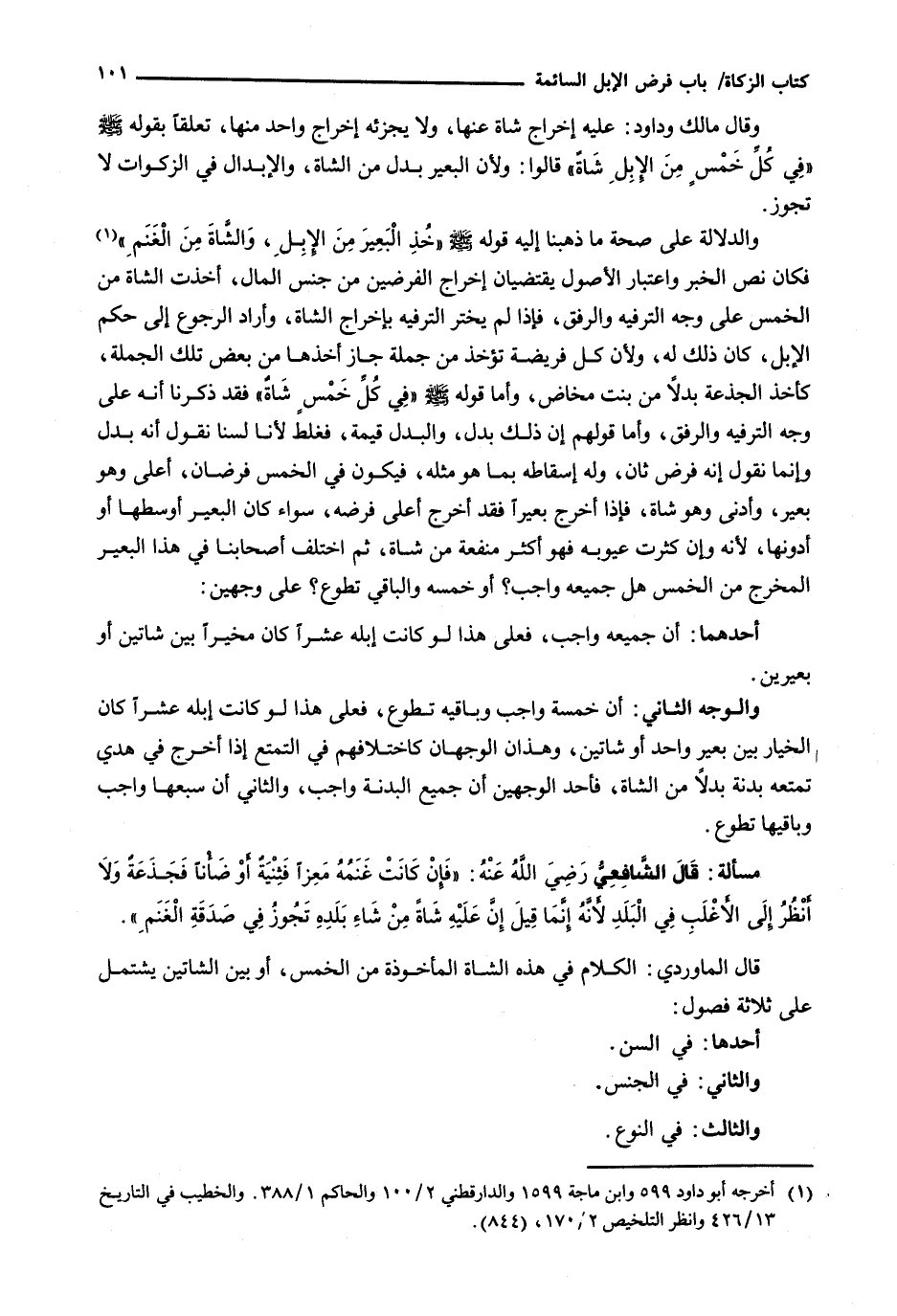 قَالَ الْمَاوَرْدِيُّ: الْكَلَامُ فِي هَذِهِ الشَّاةِ الْمَأْخُوذَةِ من الخمس، أو بين الشاتين يشتمل عل ثَلَاثَةِ فُصُولٍ: