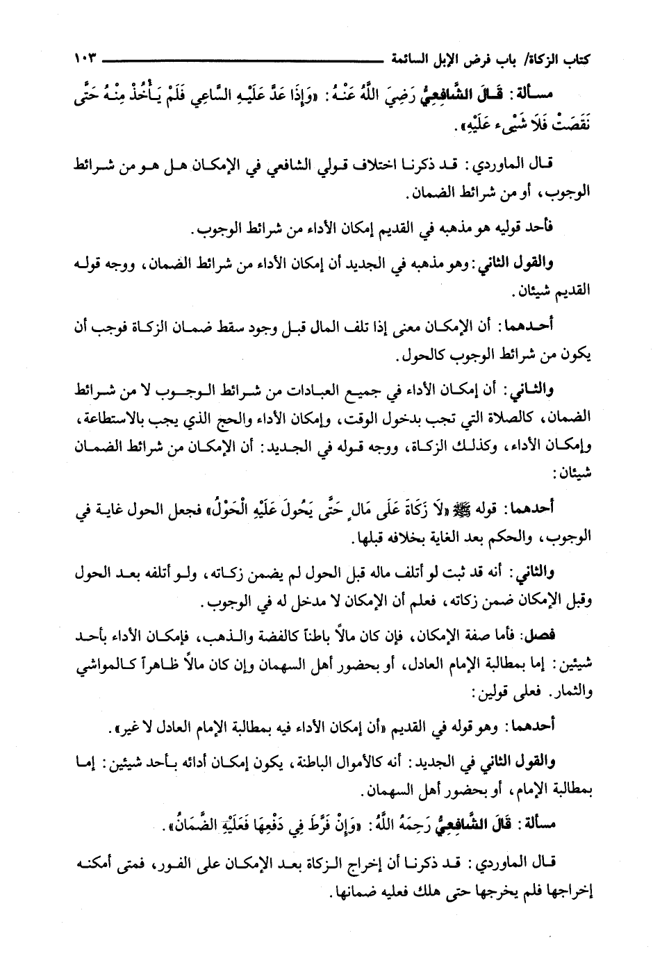 وَالثَّانِي: أَنَّ إِمْكَانَ الْأَدَاءِ فِي جَمِيعِ الْعِبَادَاتِ مِنْ شَرَائِطِ الْوُجُوبِ لَا مِنْ شَرَائِطِ الضَّمَانِ، كَالصَّلَاةِ الَّتِي تَجِبُ بِدُخُولِ الْوَقْتِ، وَإِمْكَانِ الْأَدَاءِ وَالْحَجِّ الَّذِي يَجِبُ بِالِاسْتِطَاعَةِ، وَإِمْكَانِ الْأَدَاءِ، وَكَذَلِكَ الزَّكَاةُ، وَوَجْهُ قَوْلِهِ فِي الجديد: أن الإمكان مِنْ شَرَائِطِ الضَّمَانِ شَيْئَانِ: