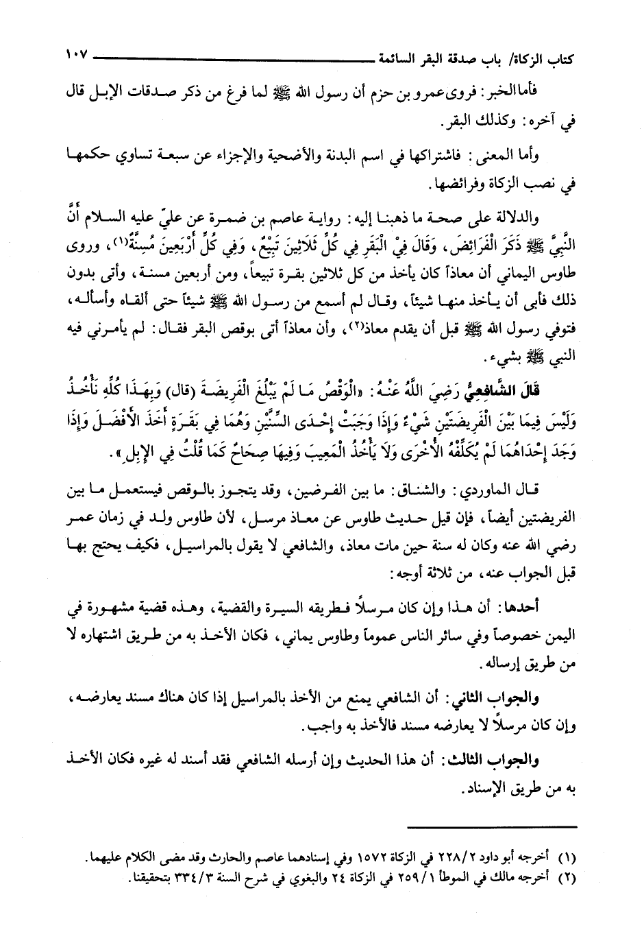 وِالدَّلَالَةُ عَلَى صِحَّةِ مَا ذَهَبْنَا إِلَيْهِ: رِوَايَةُ عَاصِمِ بْنِ ضَمْرَةَ عَنْ عَلِيٍّ عَلَيْهِ السَّلَامُ أَنَّ النَّبِيَّ - صَلَّى اللَّهُ عَلَيْهِ وَسَلَّم َ - ذَكَرَ الْفَرَائِضَ، وَقَالَ فِي الْبَقَرِ فِي كُلِّ ثَلَاثِينَ تَبِيعٌ، وَفِي كُلِّ أَرْبَعِينَ مُسِنَّةٌ، وَرَوَى طَاوُسٌ الْيَمَانِيُّ أَنَّ مُعَاذًا كَانَ يَأْخُذُ مِنْ كُلِّ ثَلَاثِينَ بَقَرَةً تَبِيعًا، وَمِنْ أَرْبَعِينَ مُسِنَّةً، وَأُتِيَ بِدُونِ ذَلِكَ فَأَبَى أَنْ يَأْخُذَ مِنْهَا شَيْئًا، وَقَالَ لَمْ أَسْمَعْ مِنْ رَسُولِ اللَّهِ - صَلَّى اللَّهُ عَلَيْهِ وَسَلَّم َ - شَيْئًا حَتَّى أَلْقَاهُ وَأَسْأَلَهُ، فَتُوُفِّيَ رَسُولُ اللَّهِ - صَلَّى اللَّهُ عَلَيْهِ وَسَلَّم َ - قَبْلَ أَنْ يَقْدَمَ مُعَاذٌ، وَأَنَّ مُعَاذًا أُتِيَ بِوَقْصِ الْبَقَرِ فَقَالَ: لَمْ يَأْمُرْنِي فِيهِ النَّبِيُّ - صَلَّى اللَّهُ عَلَيْهِ وَسَلَّم َ - بشيء.