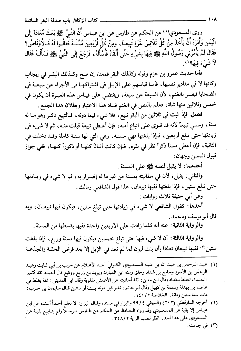 رَوَى الْمَسْعُودِيُّ عَنِ الْحَكَمِ عَنْ طَاوُسٍ عَنِ ابْنِ عَبَّاسٍ أَنَّ النَّبِيَّ - صَلَّى اللَّهُ عَلَيْهِ وَسَلَّم َ - بَعَثَ مُعَاذًا إِلَى الْيَمَنِ وَأَمَرَهُ أَنْ يَأْخُذَ مِنْ كُلِّ ثَلَاثِينَ بَقَرَةً تَبِيعًا، وَمِنْ كُلِّ أَرْبَعِينَ مُسِنَّةً فَقَالُوا لَهُ فَالْأَوْقَاصُ؟ فَقَالَ لَمْ يَأْمُرْنِي رَسُولُ اللَّهِ - صَلَّى اللَّهُ عَلَيْهِ وَسَلَّم َ - فِيهَا بِشَيْءٍ، حَتَّى أَلْقَاهُ فَأَسْأَلَهُ، فَرَجَعَ إِلَى النبي - صَلَّى اللَّهُ عَلَيْهِ وَسَلَّم َ - فَسَأَلَهُ فَقَالَ لَا شَيْءَ فِيهَا.