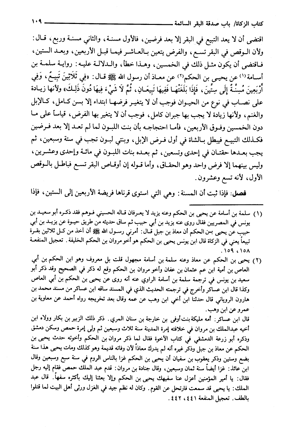 اقتضى أن لا يعد التَّبِيعُ فِي الْبَقَرِ إِلَّا بَعْدَ فَرْضَيْنِ، فَالْأَوَّلُ مُسِنَّةٌ، وَالثَّانِي مُسِنَّةٌ وَرُبُعٌ، قَالَ: وَلِأَنَّ الْوَقْصَ فِي الْبَقَرِ تِسْعٌ، وَالْفَرْضُ يَتَعَيَّنُ بِالْعَاشِرِ فِيمَا قَبْلَ الْأَرْبَعِينَ، وَبَعْدَ السِّتِّينَ، فَاقْتَضَى أَنْ يَكُونَ مِثْلَ ذَلِكَ فِي الْخَمْسِينَ، وَهَذَا خَطَأٌ، وَالدَّلَالَةُ عَلَيْهِ: رِوَايَةُ سَلَمَةَ بْنِ أُسَامَةَ عَنْ يَحْيَى بْنِ الْحَكَمِ عَنْ مُعَاذٍ أَنَّ رَسُولَ اللَّهِ - صَلَّى اللَّهُ عَلَيْهِ وَسَلَّم َ - قَالَ: " فِي ثَلَاثِينَ تَبِيعٌ، وَفِي أَرْبَعِينَ مُسِنَّةٌ إِلَى سِتِّينَ، فَإِذَا بَلَغَتْهَا فَفِيهَا تَبِيعَانِ، ثُمَّ لَا شَيْءَ فِيهَا دُونَ ذَلِكَ " وَلِأَنَّهَا زِيَادَةٌ عَلَى نِصَابٍ فِي نَوْعٍ مِنَ الْحَيَوَانِ فَوَجَبَ أَنْ لَا يَتَغَيَّرَ فَرْضُهَا ابْتِدَاءً إِلَّا بِسِنٍّ كَامِلٍ، كَالْإِبِلِ وَالْغَنَمِ، وَلِأَنَّهَا زِيَادَةٌ لَا يَجِبُ بها جبران كَامِلٌ، فَوَجَبَ أَنْ لَا يَتَغَيَّرَ بِهَا الْفَرْضُ، قِيَاسًا عَلَى مَا دُونُ الْخَمْسِينَ وَفَوْقَ الْأَرْبَعِينَ، فَأَمَّا احْتِجَاجُهُ بِأَنَّ بِنْتَ اللَّبُونِ لَمَّا لَمْ تُعَدَّ إِلَّا بَعْدَ فَرْضَيْنِ فَكَذَلِكَ التَّبِيعُ فَيَبْطُلُ بِالشَّاةِ فِي أَوَّلِ فَرْضِ الْإِبِلِ، وَبِنْتَيْ لَبُونٍ تجب في ستة وَسَبْعِينَ، ثُمَّ يَجِبُ بَعْدَهَا حِقَّتَانِ فِي إِحْدَى وتسعين، ثم بعده بَنَاتُ اللَّبُونِ فِي مِائَةٍ وَإِحْدَى وَعِشْرِينَ، وَلَيْسَ بَيْنَهُمَا إِلَّا فَرْضٌ وَاحِدٌ وَهُوَ الْحِقَاقُ، وَأَمَّا قَوْلُهُ إِنَّ أَوْقَاصَ الْبَقَرِ تِسْعٌ فَبَاطِلٌ بِالْوَقْصِ الْأَوَّلِ، لِأَنَّهُ تِسْعٌ وَعِشْرُونَ.