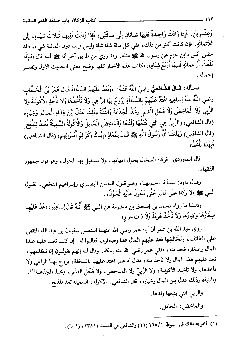 قال الشافعي رضي الله عنه: " وتعد عليهم السخلة قَالَ عُمَرُ بْنُ الْخَطَّابِ رَضِيَ اللَّهُ عَنْهُ لِسَاعِيهِ اعْتَدَّ عَلَيْهِمْ بِالسَّخْلَةِ يَرُوحُ بِهَا الرَّاعِي وَلَا تَأْخُذْهَا وَلَا تَأْخُذِ الْأَكُولَةَ وَلَا الرُّبَى وَلَا الْمَاخِضَ وَلَا فَحْلَ الْغَنَمِ وَخُذِ الْجَذَعَةَ وَالثَّنِيَّةَ وَذَلِكَ عَدْلٌ بَيْنَ غِذَاءِ الْمَالِ وَخِيَارِهِ (قال الشافعي) والربي هي التي يتبعها ولدها والماخض الحامل والأكولة السمينة تعد للذبح (قال الشافعي) وبلغنا أَنَّ رَسُولَ اللَّهِ - صَلَّى اللَّهُ عَلَيْهِ وَسَلَّم َ - قال لمعاذ " إياكم وكرائم أموالهم " (قال الشافعي) فبهذا نأخذ ".