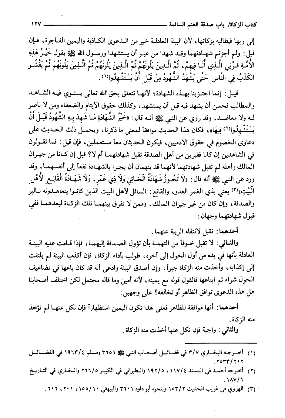 إِلَى رَبِّهَا فَيُطَالِبُهُ بِزَكَاتِهَا، لِأَنَّ الْبَيِّنَةَ الْعَادِلَةَ خَيْرٌ مِنَ الدَّعْوَى الْكَاذِبَةِ وَالْيَمِينِ الْفَاجِرَةِ، فَإِنْ قِيلَ: وَلِمَ أَجَزْتُمْ شَهَادَتَهُمَا وَقَدْ شَهِدَا مِنْ غَيْرِ أَنْ يُسْتَشْهَدَا وَرَسُولُ اللَّهِ - صَلَّى اللَّهُ عَلَيْهِ وَسَلَّم َ - يَقُولُ خَيْرُ هَذِهِ الْأُمَّةِ قَرْنِي الَّذِي أَنَا فِيهِمْ، ثُمَّ الَّذِينَ يَلُونَهُمْ ثُمَّ الَّذِينَ يَلُونَهُمْ ثُمَّ الَّذِينَ يَلُونَهُمْ ثَمَّ يَفْشُو الْكَذِبُ فِي النَّاسِ حَتَى يَشْهَدَ الشُّهُودُ مِنْ قَبْلِ أَنْ يستشهدوا.