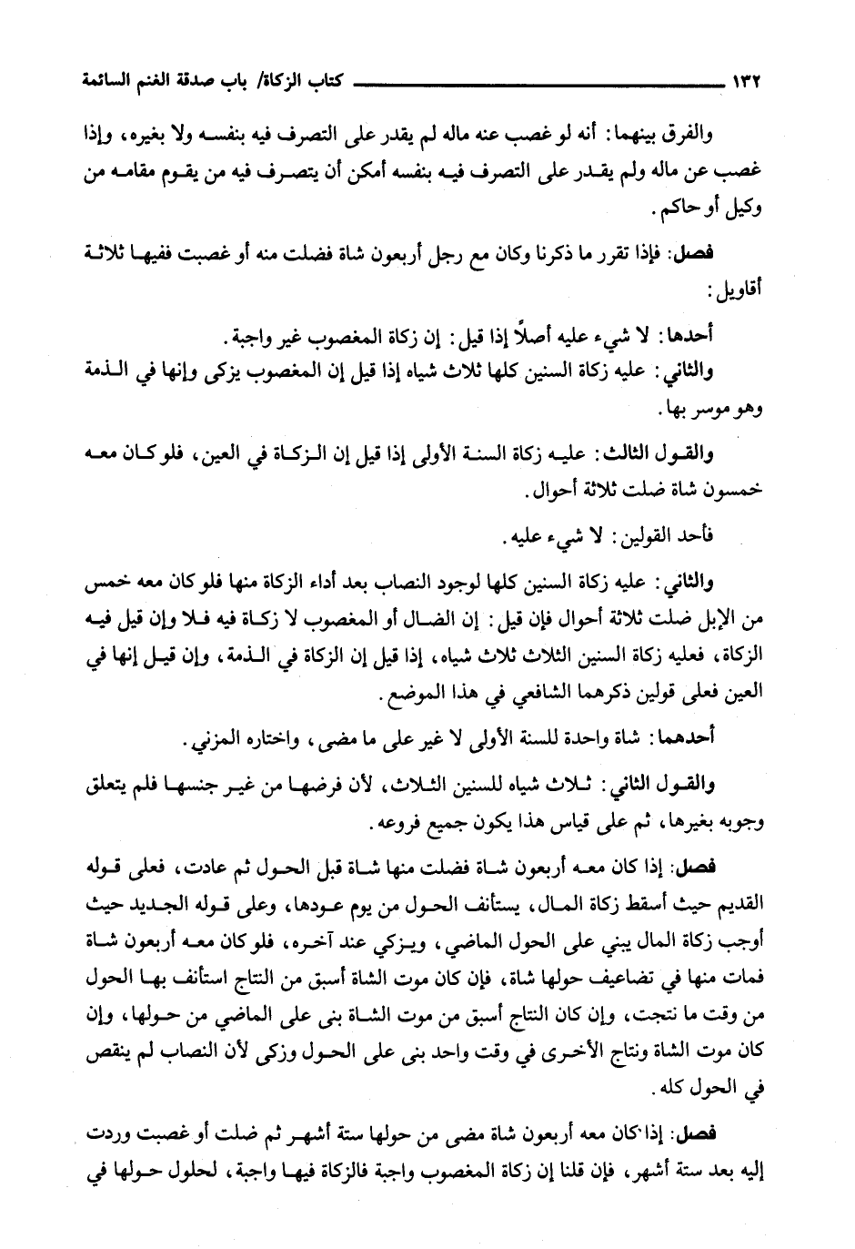 إذا كَانَ مَعَهُ أَرْبَعُونَ شَاةً فَضَلَّتْ مِنْهَا شَاةٌ قَبْلَ الْحَوْلِ ثُمَّ عَادَتْ، فَعَلَى قَوْلِهِ الْقَدِيمِ حيث أسقط زكاة المال، يَسْتَأْنِفُ الْحَوْلَ مِنْ يَوْمِ عَوْدِهَا، وَعَلَى قَوْلِهِ الجديد حيث أوجب زكاة المال يَبْنِي عَلَى الْحَوْلِ الْمَاضِي، وَيُزَكِّي عِنْدَ آخِرِهِ، فَلَوْ كَانَ مَعَهُ أَرْبَعُونَ شَاةً فَمَاتَ مِنْهَا في تضاعيف حولها شَاةٌ، فَإِنْ كَانَ مَوْتُ الشَّاةِ أَسْبَقَ مِنَ النِّتَاجِ اسْتَأْنَفَ بِهَا الْحَوْلَ مِنْ وَقْتِ مَا نَتَجَتْ، وَإِنْ كَانَ النِّتَاجُ أَسْبَقَ مِنْ مَوْتِ الشَّاةِ بَنَى عَلَى الْمَاضِي مِنْ حَوْلِهَا، وَإِنْ كَانَ مَوْتُ الشَّاةِ وَنِتَاجُ الْأُخْرَى فِي وَقْتٍ وَاحِدٍ بَنَى عَلَى الْحَوْلِ وَزَكَّى لِأَنَّ النِّصَابَ لَمْ يُنْقَصْ فِي الْحَوْلِ كُلِّهِ.