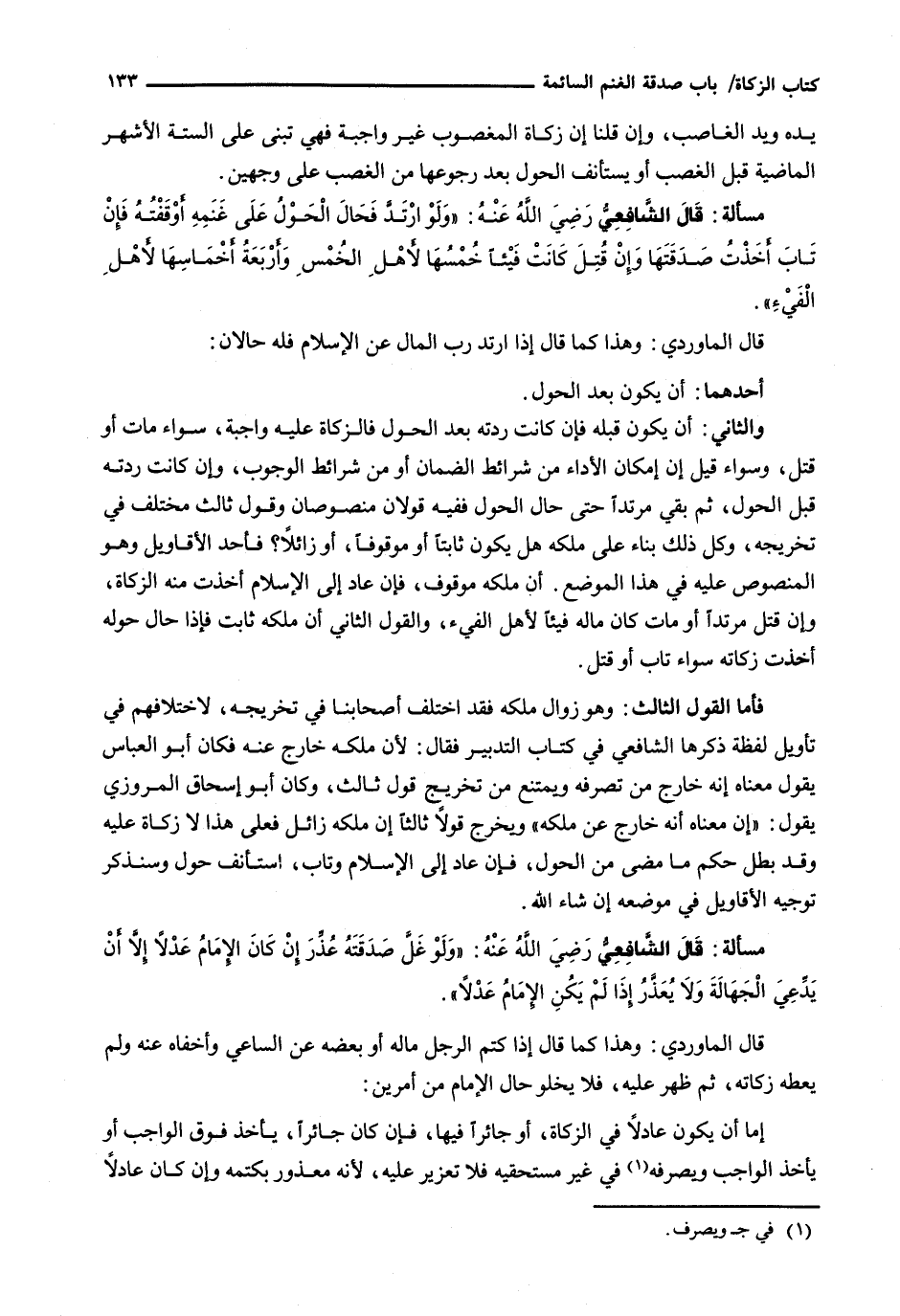 قال الشافعي رضي الله عنه: " ولو ارتد فحال الحول على غنمه أوقفته فإن تاب أخذت صدقتها وإن قتل كانت فيئاً خمسها لأهل الخمس وأربعة أخماسها لأهل الْفَيْءِ ".