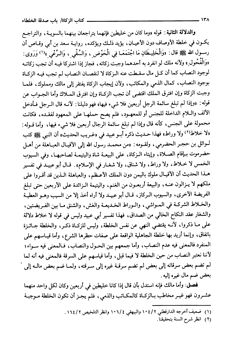 والدلالة الثانية: قَوْلُهُ " وَمَا كَانَ مِنْ خَلِيطَيْنِ فَإِنَّهُمَا يَتَرَاجَعَانِ بَيْنَهُمَا بِالسَّوِيَّةِ، وَالتَّرَاجُعُ يَكُونُ فِي خُلْطَةِ الْأَوْصَافِ دُونَ الْأَعْيَانِ، يُؤَيِّدُ ذَلِكَ وَيُؤَكِّدُهُ، رِوَايَةُ سَعْدِ بْنِ أَبِي وَقَّاصٍ أَنَّ رَسُولَ اللَّهِ - صَلَّى اللَّهُ عَلَيْهِ وَسَلَّم َ - قَالَ: " وَالْخَلِيطَانِ مَا اجْتَمَعَا فِي الْحَوْضِ، وَالسَّقْيِ، وَالرَّعْيِ " وَرُوِيَ: " وَالْفُحُولِ " وَلِأَنَّهُ مِلْكٌ لَوِ انْفَرَدَ بِهِ أَحَدُهُمَا وَجَبَتْ زَكَاتُهُ، فَجَازَ إِذَا اشْتَرَكَا فِيهِ أَنْ تَجِبَ زَكَاتُهُ لِوُجُودِ النِّصَابِ كَمَا أَنَّ كُلَّ مَالٍ سَقَطَتْ عَنْهُ الزَّكَاةُ لَا لِنُقْصَانِ النِّصَابِ لَمْ تَجِبْ فِيهِ الزَّكَاةُ بِوُجُودِ النِّصَابِ، كَمَالِ الذِّمِّيِّ وَالْمُكَاتَبِ، وَلِأَنَّ إِيجَابَ الزَّكَاةِ يَفْتَقِرُ إِلَى مَالِكٍ وَمَمْلُوكٍ، فَلَمَّا وَجَبَتِ الزَّكَاةُ وَإِنِ افْتَرَقَ الْمِلْكُ اقْتَضَى أَنْ تَجِبَ الزَّكَاةُ وإن افترق الملاك وأما الْجَوَابُ عَنْ قَوْلِهِ: " وَإِذَا لَمْ تَبْلُغْ سَائِمَةُ الرَّجُلِ أَرْبَعِينَ فَلَا شَيْءَ فِيهَا " فَهُوَ دَلِيلُنَا: لِأَنَّهُ قَالَ الرَّجُلِ فَأَدْخَلَ الْأَلِفَ وَاللَّامَ الدَّاخِلَةَ لِلْجِنْسِ أَوْ لِلْمَعْهُودِ، فَلَمْ يَصِحَّ حَمْلُهَا عَلَى المعهود لفقده، فكانت محمولة على الجنس، كَأَنَّهُ قَالَ وَإِذَا لَمْ تَبْلُغْ سَائِمَةَ الرِّجَالِ أَرْبَعِينَ فَلَا شَيْءَ فِيهَا، وَأَمَّا قَوْلُهُ: " لَا خِلَاطَ وَلَا وِرَاطَ " فَهَذَا حَدِيثٌ ذَكَرَهُ أَبُو عُبَيْدٍ فِي " غَرِيبِ الْحَدِيثِ " أَنَّ النَّبِيَّ - صَلَّى اللَّهُ عَلَيْهِ وَسَلَّم َ - كَتَبَ لِوَائِلِ بْنِ حُجْرٍ الْحَضْرَمِيِّ، وَلِقَوْمِهِ: " مِنْ محمد رسول الله إِلَى الْأَقْيَالِ الْعَبَاهِلَةِ مِنْ أَهْلِ حَضْرَمَوْتَ بِإِقَامِ الصلاة، وإيتاء الزكاة، على البيعة شاة واليتيمة لصاحبها، وفي السيوب الخمس لَا خِلَاطَ، وَلَا وِرَاطَ، وَلَا شِنَاقَ، وَلَا شِغَارَ فِي الْإِسْلَامِ ". قَالَ أَبُو عُبَيْدٍ فِي تَفْسِيرِ هَذَا الْحَدِيثِ إِنَّ الْأَقْيَالَ مُلُوكٌ بِالْيَمَنِ دُونَ الْمَلِكِ الْأَعْظَمِ، وَالْعَبَاهِلَةِ الَّذِينَ قَدْ أُقِرُّوا على ملكهم لا يزالون عنه، والبيعة أربعون من الغنم، واليتيمة الزَّائِدَةُ عَلَى الْأَرْبَعِينَ حَتَّى تَبْلُغَ الْفَرِيضَةُ الْأُخْرَى، وَالسُّيُوبُ الرِّكَازُ، قَالَ أَبُو عُبَيْدٍ وَلَا أَرَاهُ أُخِذَ إِلَّا مِنَ السَّيْبِ وَهُوَ الْعَطِيَّةُ وَالْخِلَاطُ الشركة في المواشي، والوراط الخديعة والغش، والشنق مَا بَيْنَ الْفَرِيضَتَيْنِ، وَالشَّغَارُ عَقْدُ النِّكَاحِ الْخَالِي مِنَ الصَّدَاقِ، فَهَذَا تَفْسِيرُ أَبِي عُبَيْدٍ وَلَيْسَ فِي قَوْلِهِ لَا خِلَاطَ دَلَالَةٌ عَلَى مَا ذَكَرُوا، لِأَنَّهُ يَقْتَضِي النَّهْيَ عَنْ نَفْسِ الْخُلْطَةِ، وَلَيْسَ لِلزَّكَاةِ ذِكْرٌ، وَالْخُلْطَةُ جَائِزَةٌ بِاتِّفَاقٍ، وَإِنَّمَا أُرِيدَ بِهَا خُلْطَةُ الْجَاهِلِيَّةِ الْوَاقِعَةُ عَلَى صِفَاتٍ حَظَرَهَا الشَّرْعُ، وَأَمَّا قِيَاسُهُمْ عَلَى الْمُنْفَرِدِ فَالْمَعْنَى فِيهِ عَدَمُ النِّصَابِ، وَأَمَّا جَمْعُهُمْ بَيْنَ الْحَوْلِ والنصاب، فالمعنى فيه سَوَاءٌ، لِأَنَّنَا نَعْتَبِرُ النِّصَابَ مِنْ حِينِ الْخُلْطَةِ لَا فِيمَا قَبْلُ، وَأَمَّا قِيَاسُهُمْ عَلَى السَّرِقَةِ فَالْمَعْنَى فِيهِ أَنَّهُ لَمَّا لَمْ تُضَمَّ بَعْضُ سَرِقَاتِهِ إِلَى بَعْضٍ لَمْ تُضَمَّ سَرِقَةُ غَيْرِهِ إِلَى سَرِقَتِهِ، وَلَمَّا ضُمَّ بَعْضُ مَالِهِ إِلَى بَعْضٍ ضُمَّ مَالُ غَيْرِهِ إِلَيْهِ.