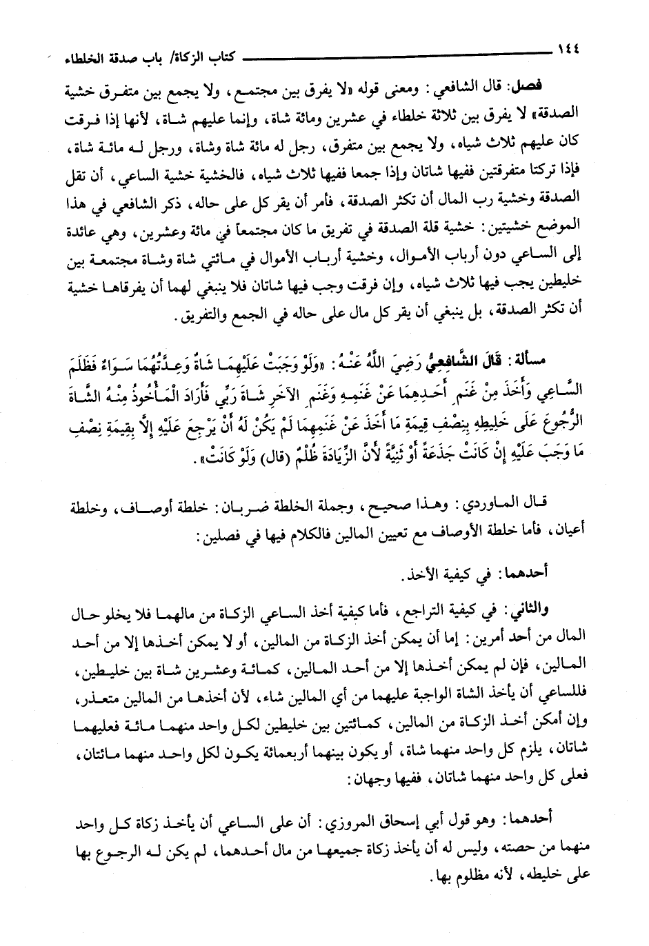 : قال الشافعي: وَمَعْنَى قَوْلِهِ " لَا يُفَرَّقُ بَيْنَ مُجْتَمَعٍ، وَلَا يُجْمَعُ بَيْنَ مُتَفَرِّقٍ خَشْيَةَ الصَّدَقَةِ " لَا يُفَرِّقُ بَيْنَ ثَلَاثَةِ خُلَطَاءَ فِي عِشْرِينَ وَمِائَةِ شَاةٍ، وَإِنَّمَا عَلَيْهِمْ شَاةٌ، لِأَنَّهَا إِذَا فُرِّقَتْ كَانَ عَلَيْهِمْ ثَلَاثُ شِيَاهٍ، وَلَا يُجْمَعُ بَيْنَ مُتَفَرِّقٍ، رَجُلٌ لَهُ مِائَةُ شَاةٍ وَشَاةٌ، وَرَجُلٌ لَهُ مائة شاة، فإذا تركتا متفرقتين ففيها شاتان وإذا جمعا ففيها ثَلَاثُ شِيَاهٍ، فَالْخَشْيَةُ خَشْيَةُ السَّاعِي، أَنْ تَقِلَّ الصَّدَقَةُ وَخَشْيَةُ رَبِّ الْمَالِ أَنْ تَكْثُرَ الصَّدَقَةُ، فأمر أن يقر كل على حاله، ذَكَرَ الشَّافِعِيُّ فِي هَذَا الْمَوْضِعِ خَشْيَتَيْنِ: خَشْيَةُ قِلَّةِ الصَّدَقَةِ فِي تَفْرِيقِ مَا كَانَ مُجْتَمِعًا فِي مِائَةٍ وَعِشْرِينَ، وَهِيَ عَائِدَةٌ إِلَى السَّاعِي دُونَ أَرْبَابِ الْأَمْوَالِ، وَخَشْيَةُ أَرْبَابِ الْأَمْوَالِ فِي مائتي شاة وشاة مجتمعة بين خليطين يجب فِيهَا ثَلَاثُ شِيَاهٍ، وَإِنْ فُرِّقَتْ وَجَبَ فِيهَا شاتان لفا يَنْبَغِي لَهُمَا أَنْ يُفَرِّقَاهَا خَشْيَةَ أَنْ تَكْثُرَ الصَّدَقَةُ، بَلْ يَنْبَغِي أَنْ يُقَرَّ كُلُّ مَالٍ على حاله في الجمع والتفريق.