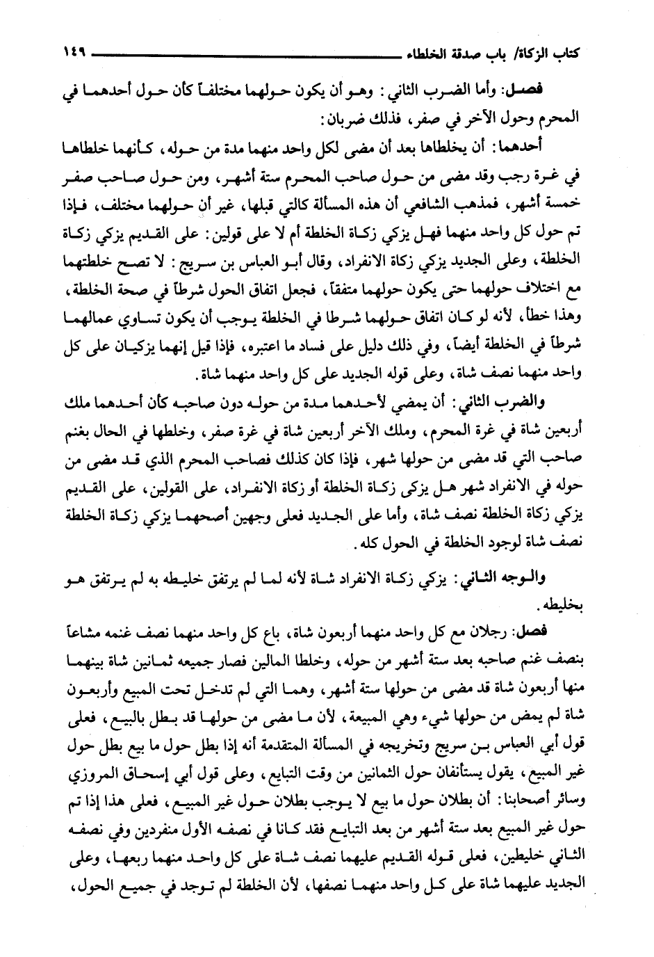 وَالضَّرْبُ الثَّانِي: أَنْ يَمْضِيَ لِأَحَدِهِمَا مُدَّةٌ مِنْ حَوْلِهِ دُونَ صَاحِبِهِ كَأَنَّ أَحَدَهُمَا مَلَكَ أَرْبَعِينَ شَاةً فِي غُرَّةِ الْمُحَرَّمِ، وَمَلَكَ الْآخَرُ أَرْبَعِينَ شاة فِي غُرَّةِ صَفَرٍ، وَخَلَطَهَا فِي الْحَالِ بِغَنَمِ صاحب الَّتِي قَدْ مَضَى مِنْ حَوْلِهَا شَهْرٌ، فَإِذَا كَانَ كَذَلِكَ فَصَاحِبُ الْمُحَرَّمِ الَّذِي قَدْ مَضَى مِنْ حَوْلِهِ فِي الِانْفِرَادِ شَهْرٌ هَلْ يُزَّكِّي زَكَاةَ الْخُلْطَةِ أَوْ زَكَاةَ الِانْفِرَادِ، عَلَى الْقَوْلَيْنِ، عَلَى الْقَدِيمِ يُزَكِّي زَكَاةَ الْخُلْطَةِ نِصْفَ شَاةٍ، وأما على الْجَدِيدِ فَعَلَى وَجْهَيْنِ أَصَحُّهُمَا يُزَكِّي زَكَاةَ الْخُلْطَةِ نِصْفَ شَاةٍ لِوُجُودِ الْخُلْطَةِ فِي الْحَوْلِ كُلِّهِ.