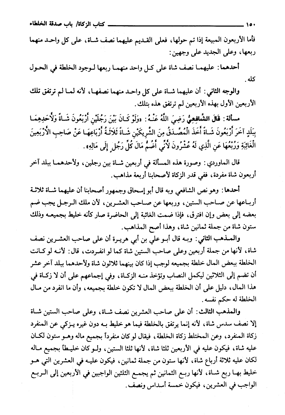 قَالَ الْمَاوَرْدِيُّ: وَصُورَةُ هَذِهِ الْمَسْأَلَةِ فِي أَرْبَعِينَ شَاةً بَيْنَ رَجُلَيْنِ، وَلِأَحَدِهِمَا بِبَلَدٍ آخر أربعون شَاةً مُفْرِدَةً، فَفِي قَدْرِ الزَّكَاةِ لِأَصْحَابِنَا أَرْبَعَةُ مَذَاهِبَ.