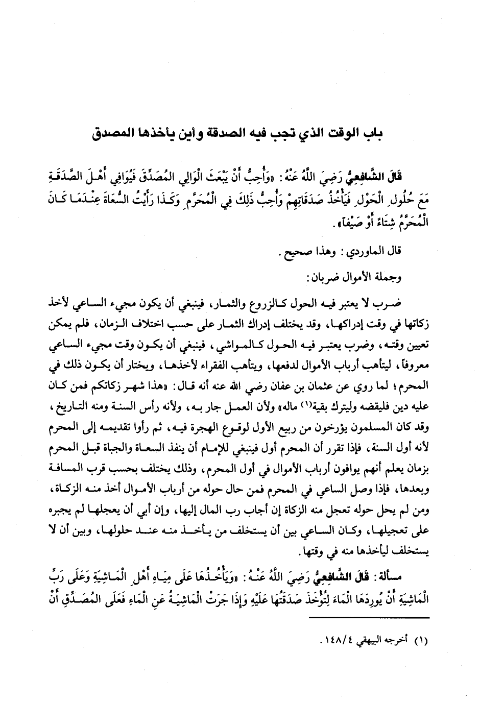 قال الشافعي رضي الله عنه: " وأحب أَنْ يَبْعَثَ الْوَالِي الْمُصَدِّقَ فَيُوَافِي أَهْلَ الصَّدَقَةِ مَعَ حُلُولِ الْحَوْلِ فَيَأْخُذُ صَدَقَاتِهِمْ وَأُحِبُّ ذَلِكَ في المحرم وكذا رأيت السعاة عندما كَانَ الْمُحَرَّمُ شِتَاءً أَوْ صَيْفًا ".