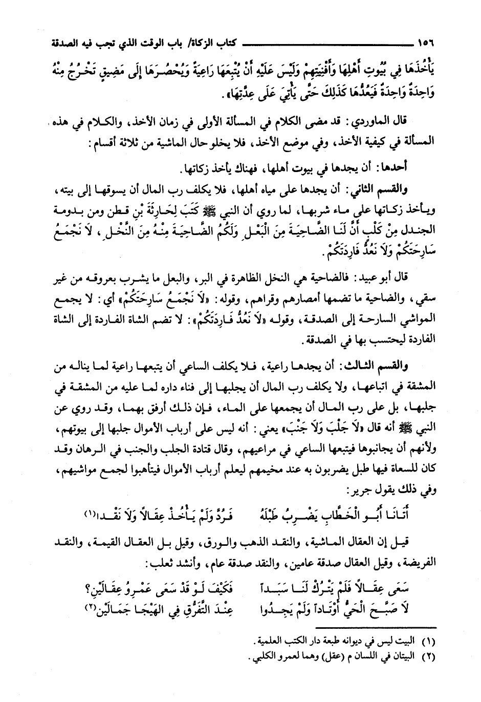 وَالْقِسْمُ الثَّانِي: أَنْ يَجِدَهَا عَلَى مِيَاهِ أَهْلِهَا، فَلَا يُكَلِّفُ رَبَّ الْمَالِ أَنْ يَسُوقَهَا إِلَى بَيْتِهِ، وَيَأْخُذُ زَكَاتَهَا عَلَى مَاءِ شُرْبِهَا، لِمَا رُوِيَ أَنَّ النَّبِيَّ - صَلَّى اللَّهُ عَلَيْهِ وَسَلَّم َ - كَتَبَ لِحَارِثَةَ بْنِ قَطَنٍ وَمَنْ بِدَوْمَةِ الْجَنْدَلِ مِنْ كَلْبٍ إِنَّ لَنَا الضَّاحِيَةَ مِنَ الْبَعْلِ ولكم الضاحية منه من النخل، لا نجمع سارحتكم ولا نعد فَارِدَتَكُمْ.