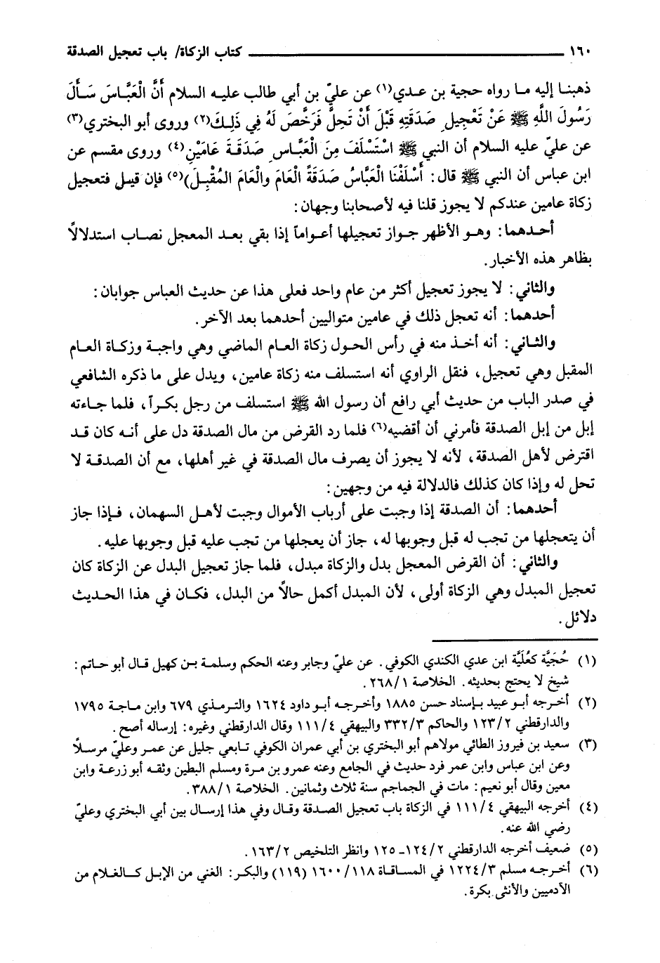 ذَهَبْنَا إِلَيْهِ مَا رَوَاهُ حُجَيَّةُ بْنُ عَدِيٍّ عَنْ عَلِيِّ بْنِ أَبِي طَالِبٍ عَلَيْهِ السَّلَامُ أَنَّ الْعَبَّاسَ سَأَلَ رَسُولَ اللَّهِ - صَلَّى اللَّهُ عَلَيْهِ وَسَلَّم َ - عن تَعْجِيلِ صَدَقَتِهِ قَبْلَ أَنْ تَحِلَّ فَرَخَّصَ لَهُ فِي ذَلِكَ وَرَوَى أَبُو الْبَخْتَرِيِّ عَنْ عَلِيٍّ عَلَيْهِ السَّلَامُ أَنَّ النَّبِيَّ - صَلَّى اللَّهُ عَلَيْهِ وَسَلَّم َ - اسْتَسْلَفَ مِنَ الْعَبَّاسِ صَدَقَةَ عَامَيْنِ وَرَوَى مِقْسَمٌ عَنِ ابْنِ عَبَّاسٍ أَنَّ النَّبِيَّ - صَلَّى اللَّهُ عَلَيْهِ وَسَلَّم َ - قَالَ: أَسْلَفَنَا الْعَبَّاسُ صَدَقَةَ الْعَامِ وَالْعَامِ الْمُقْبِلِ) فإذا قِيلَ فَتَعْجِيلُ زَكَاةِ عَامَيْنِ عِنْدَكُمْ لَا يَجُوزُ قُلْنَا فِيهِ لِأَصْحَابِنَا وَجْهَانِ: