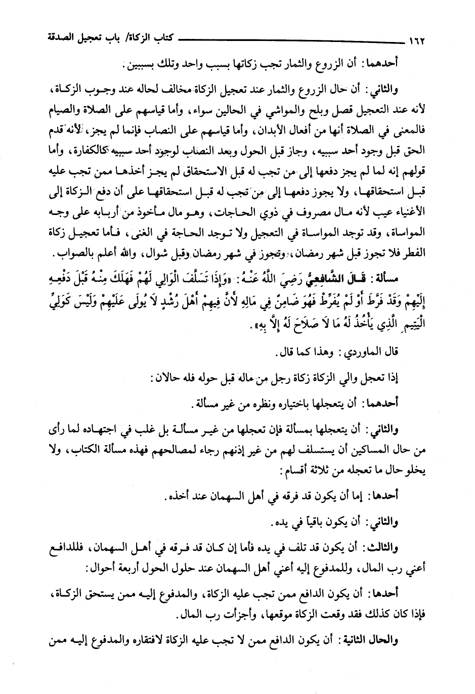 وَالثَّانِي: أَنْ يَتَعَجَّلَهَا بِمَسْأَلَةٍ فَإِنْ تَعَجَّلَهَا مِنْ غَيْرِ مَسْأَلَةٍ بَلْ غَلَبَ فِي اجْتِهَادِهِ لِمَا رَأَى مِنْ حَالِ الْمَسَاكِينِ أَنْ يَسْتَسْلِفَ لَهُمْ مِنْ غَيْرِ إِذْنِهِمْ رَجَاءً لِمَصَالِحِهِمْ فَهَذِهِ مَسْأَلَةُ الْكِتَابِ، وَلَا يَخْلُو حَالُ مَا تَعَجَّلَهُ مِنْ ثَلَاثَةِ أقسام: