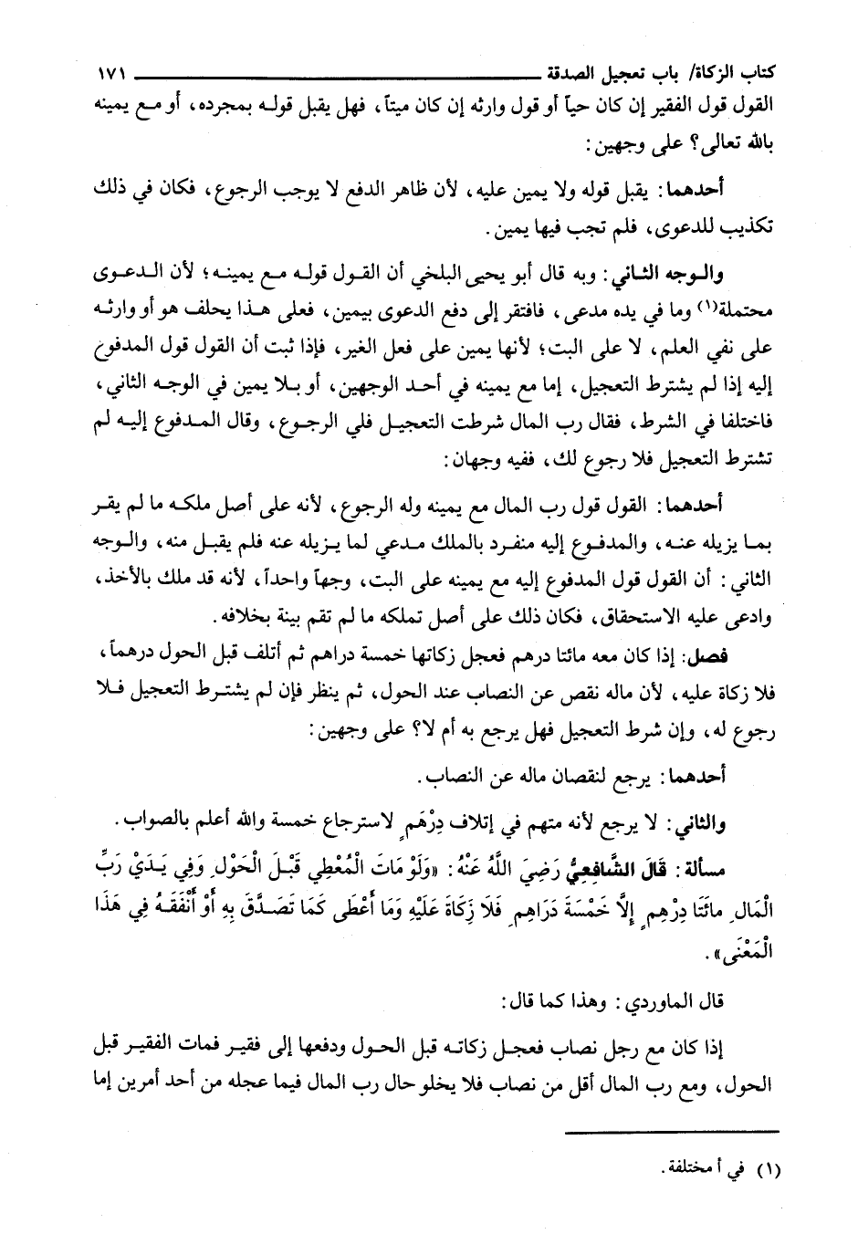 : إِذَا كَانَ مَعَهُ مِائَتَا دِرْهَمٍ فَعَجَّلَ زَكَاتَهَا خَمْسَةَ دَرَاهِمَ ثُمَّ أَتْلَفَ قَبْلَ الْحَوْلِ دِرْهَمًا، فَلَا زَكَاةَ عَلَيْهِ، لِأَنَّ مَالَهُ نَقَصَ عَنِ النِّصَابِ عِنْدَ الْحَوْلِ، ثُمَّ يُنْظَرُ فَإِنْ لَمْ يَشْتَرَطِ التَّعْجِيلَ فَلَا رُجُوعَ لَهُ، وَإِنْ شَرَطَ التَّعْجِيلَ فَهَلْ يَرْجِعُ بِهِ أَمْ لَا؟ عَلَى وَجْهَيْنِ: