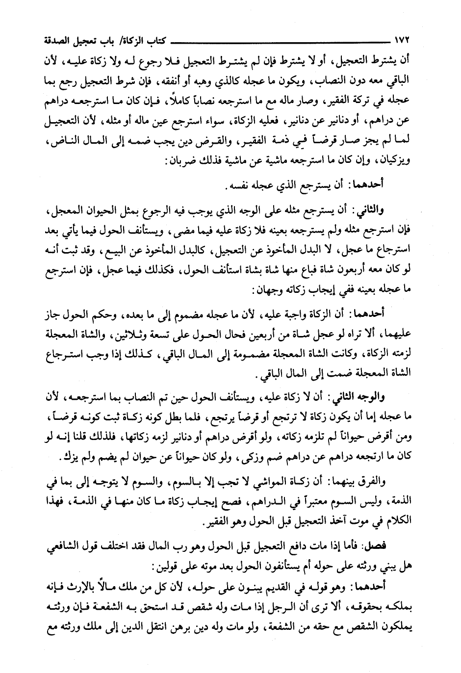أَنْ يَشْتَرِطَ التَّعْجِيلَ، أَوْ لَا يَشْتَرِطَ فَإِنْ لَمْ يَشْتَرِطِ التَّعْجِيلَ فَلَا رُجُوعَ لَهُ وَلَا زَكَاةَ عَلَيْهِ، لِأَنَّ الْبَاقِيَ مَعَهُ دُونَ النِّصَابِ، وَيَكُونُ مَا عَجَّلَهُ كَالَّذِي وَهَبَهُ أَوْ أَنْفَقَهُ، فإن شَرَطَ التَّعْجِيلَ رَجَعَ بِمَا عَجَّلَهُ فِي تَرِكَةِ الْفَقِيرِ، وَصَارَ مَالُهُ مَعَ مَا اسْتَرْجَعَهُ نِصَابًا كَامِلًا، فَإِنْ كَانَ مَا اسْتَرْجَعَهُ دَرَاهِمَ عَنْ دَرَاهِمَ، أَوْ دَنَانِيرَ عَنْ دَنَانِيرَ، فَعَلَيْهِ الزَّكَاةُ، سَوَاءٌ اسْتَرْجَعَ عَيْنَ مَالِهِ أَوْ مِثْلَهُ، لِأَنَّ التَّعْجِيلَ لَمَّا لَمْ يَجُزْ صَارَ قَرْضًا فِي ذِمَّةِ الْفَقِيرِ، وَالْقَرْضُ دَيْنٌ يَجِبُ ضَمُّهُ إِلَى الْمَالِ النَّاضِّ، وَيُزَكَّيَانِ، وَإِنْ كَانَ مَا اسْتَرْجَعَهُ مَاشِيَةً عَنْ مَاشِيَةٍ فَذَلِكَ ضَرْبَانِ:
