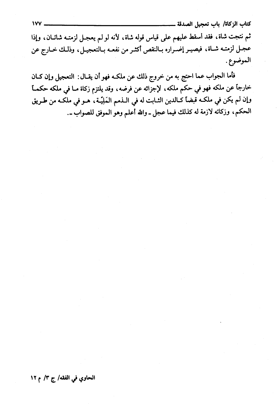 فَأَمَّا الْجَوَابُ عَمَّا احْتَجَّ بِهِ مِنْ خُرُوجِ ذَلِكَ عَنْ مِلْكِهِ فَهُوَ أَنْ يُقَالَ: التَّعْجِيلُ وَإِنْ كَانَ خَارِجًا عَنْ مِلْكِهِ فَهُوَ فِي حُكْمِ مِلْكِهِ، لِإِجْزَائِهِ عَنْ فَرْضِهِ، وَقَدْ يَلْتَزِمُ زَكَاةَ مَا فِي مِلْكِهِ حُكْمًا وَإِنْ لَمْ يَكُنْ فِي مِلْكِهِ قَبْضًا كَالدَّيْنِ الثَّابِتِ لَهُ فِي الذِّمَمِ الْمَلِيَّةِ، هُوَ فِي مِلْكِهِ مِنْ طَرِيقِ الْحُكْمِ، وَزَكَاتُهُ لَازِمَةٌ له كذلك فيهما عَجَّلَ - وَاللَّهُ أَعْلَمُ وَهُوَ الْمُوَفِّقُ لِلصَّوَابِ -.
