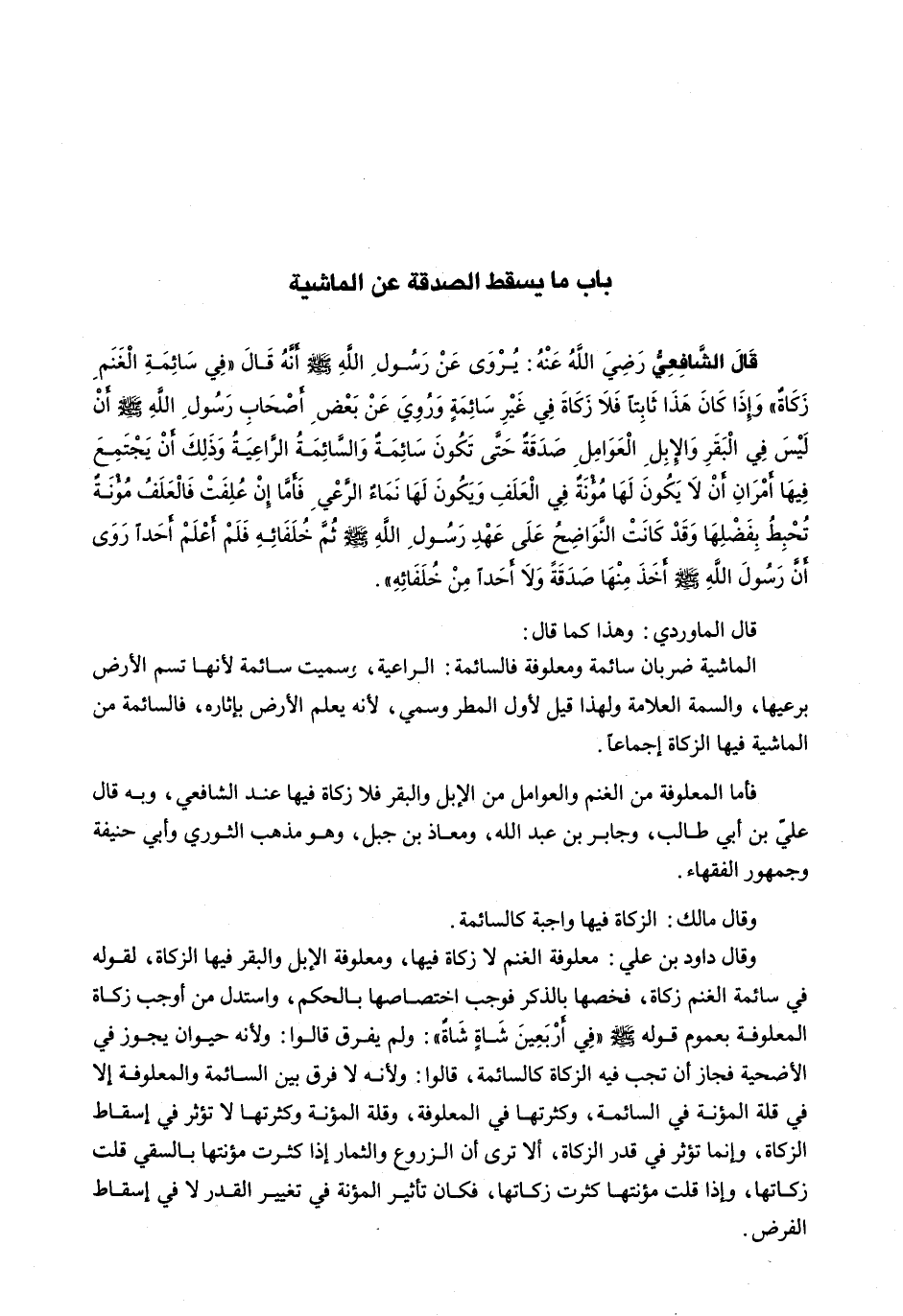قال الشافعي رضي الله عنه: يُرْوَى عَنْ رَسُولِ اللَّهِ - صَلَّى اللَّهُ عَلَيْهِ وَسَلَّم َ - أنه قال " في سائمة الغنم زكاةٌ " وإذا كَانَ هَذَا ثَابِتًا فَلَا زَكَاةَ فِي غَيْرِ سائمة وروي عن بعض أَصْحَابِ رَسُولِ اللَّهِ - صَلَّى اللَّهُ عَلَيْهِ وَسَلَّم َ - أن ليس في البقر والإبل العوامل صدقة حتى تكون سائمة والسائمة الراعية وذلك أن يجتمع فيها أمران أن لا يكون لها مؤنة في العلف ويكون لها نماء الرعي فأما إن علفت فالعلف مؤنة تحبط بفضلها وقد كانت النواضح عَلَى عَهْدِ رَسُولِ اللَّهِ - صَلَّى اللَّهُ عَلَيْهِ وَسَلَّم َ - ثم خلفائه فلم أعلم أحداً رُوِيَ أَنَّ رَسُولَ اللَّهِ - صَلَّى اللَّهُ عَلَيْهِ وَسَلَّم َ - أخذ منها صدقة ولا أحداً من خلفائه ".
