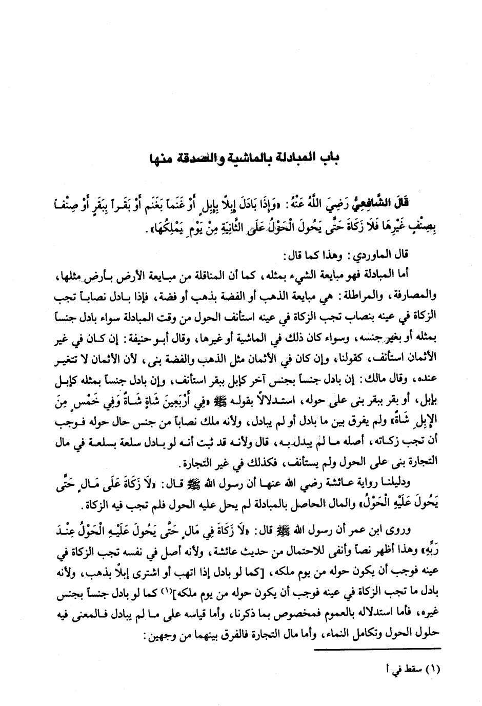 قال الشافعي رضي الله عنه: " وَإِذَا بَادَلَ إِبِلًا بإبلٍ أَوْ غَنَمًا بَغَنَمٍ أو بقراً ببقرٍ أو صنفاً بصنفٍ غَيْرِهَا فَلَا زَكَاةَ حَتَّى يَحُولَ الْحَوْلُ عَلَى الثانية من يوم يملكها ".