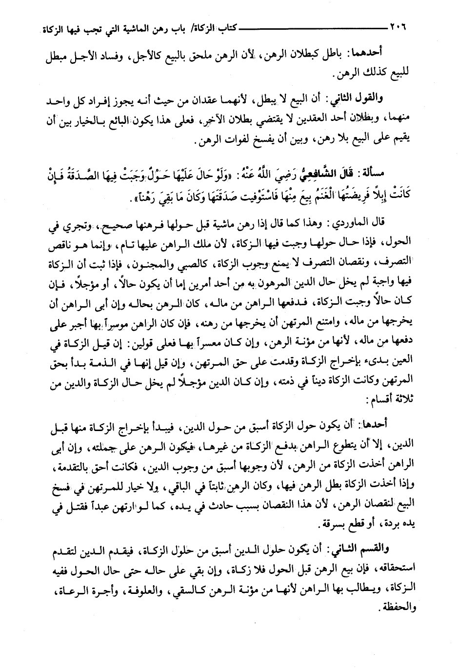 قَالَ الْمَاوَرْدِيُّ: وَهَذَا كَمَا قَالَ إِذَا رَهَنَ مَاشِيَةً قَبْلَ حَوْلِهَا فَرَهْنُهَا صَحِيحٌ، وَتَجْرِي فِي الْحَوْلِ، فَإِذَا حَالَ حَوْلُهَا وَجَبَتْ فِيهَا الزَّكَاةُ، لِأَنَّ مِلْكَ الرَّاهِنِ عَلَيْهَا تَامٌّ، وَإِنَّمَا هُوَ نَاقِصُ التَّصَرُّفِ، وَنُقْصَانُ التَّصَرُّفِ لَا يَمْنَعُ وُجُوبَ الزَّكَاةِ، كَالصَّبِيِّ وَالْمَجْنُونِ، فَإِذَا ثَبَتَ أَنَّ الزَّكَاةَ فِيهَا وَاجِبَةٌ لَمْ يَخْلُ حَالُ الدَّيْنِ الْمَرْهُونِ بِهِ مِنْ أَحَدِ أَمْرَيْنِ إِمَّا أَنْ يَكُونَ حَالًّا، أَوْ مُؤَجَّلًا، فَإِنْ كَانَ حَالًا وَجَبَتِ الزَّكَاةُ، فَدَفَعَهَا الرَّاهِنُ مِنْ مَالِهِ، كَانَ الرَّهْنُ بِحَالِهِ وَإِنْ أَبَى الرَّاهِنُ أَنْ يُخْرِجَهَا مِنْ مَالِهِ، وَامْتَنَعَ الْمُرْتَهِنُ أَنْ يُخْرِجَهَا مِنْ رَهْنِهِ، فَإِنْ كَانَ الرَّاهِنُ مُوسِرًا بِهَا أُجْبِرَ عَلَى دَفْعِهَا مِنْ مَالِهِ، لِأَنَّهَا مِنْ مُؤْنَةِ الرَّهْنِ، وَإِنْ كَانَ معسراً بها فعلى قولين: إن قيل الزَّكَاةَ فِي الْعَيْنِ بُدِئَ بِإِخْرَاجِ الزَّكَاةِ وَقُدِّمَتْ عَلَى حَقِّ الْمُرْتَهِنِ، وَإِنْ قِيلَ إِنَّهَا فِي الذمة بدأ بِحَقِّ الْمُرْتَهِنِ وَكَانَتِ الزَّكَاةُ دَيْنًا فِي ذِمَّتِهِ، وَإِنْ كَانَ الدَّيْنُ مُؤَجَّلًا لَمْ يَخْلُ حَالُ الزَّكَاةِ وَالدَّيْنِ مِنْ ثَلَاثَةِ أَقْسَامٍ: