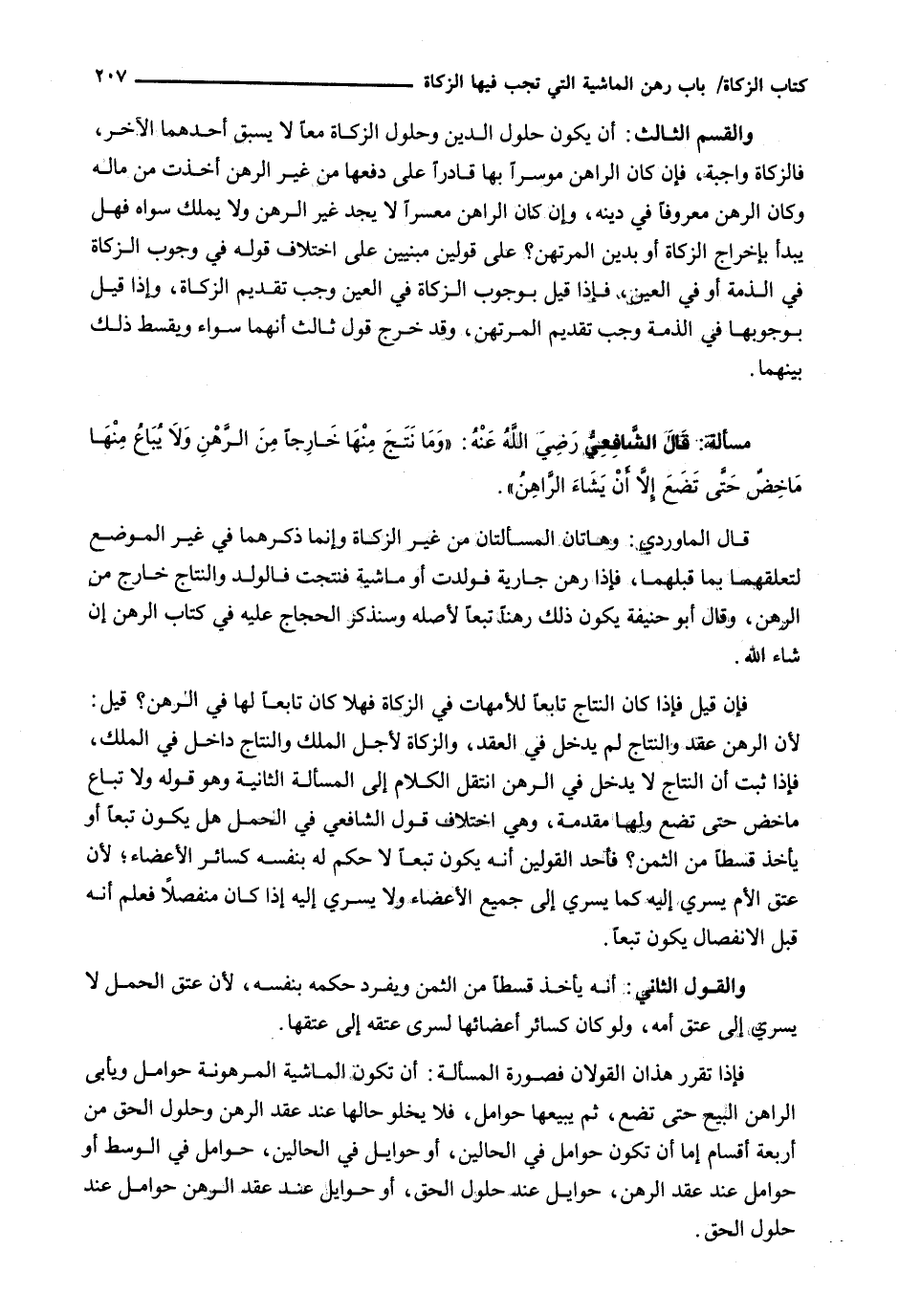 قَالَ الْمَاوَرْدِيُّ: وَهَاتَانِ الْمَسْأَلَتَانِ مِنْ غَيْرِ الزَّكَاةِ وإنما ذكرهما في غير الْمَوْضِعِ لِتَعَلُّقِهِمَا بِمَا قَبْلَهُمَا، فَإِذَا رَهَنَ جَارِيَةً فَوَلَدَتْ أَوْ مَاشِيَةً فَنَتَجَتْ فَالْوَلَدُ وَالنِّتَاجُ خَارِجٌ مِنَ الرَّهْنِ، وَقَالَ أبو حنيفة يَكُونُ ذَلِكَ رَهْنًا تَبَعًا لِأَصْلِهِ وَسَنَذْكُرُ الْحِجَاجَ عَلَيْهِ فِي كِتَابِ الرَّهْنِ إِنْ شَاءَ اللَّهُ.
