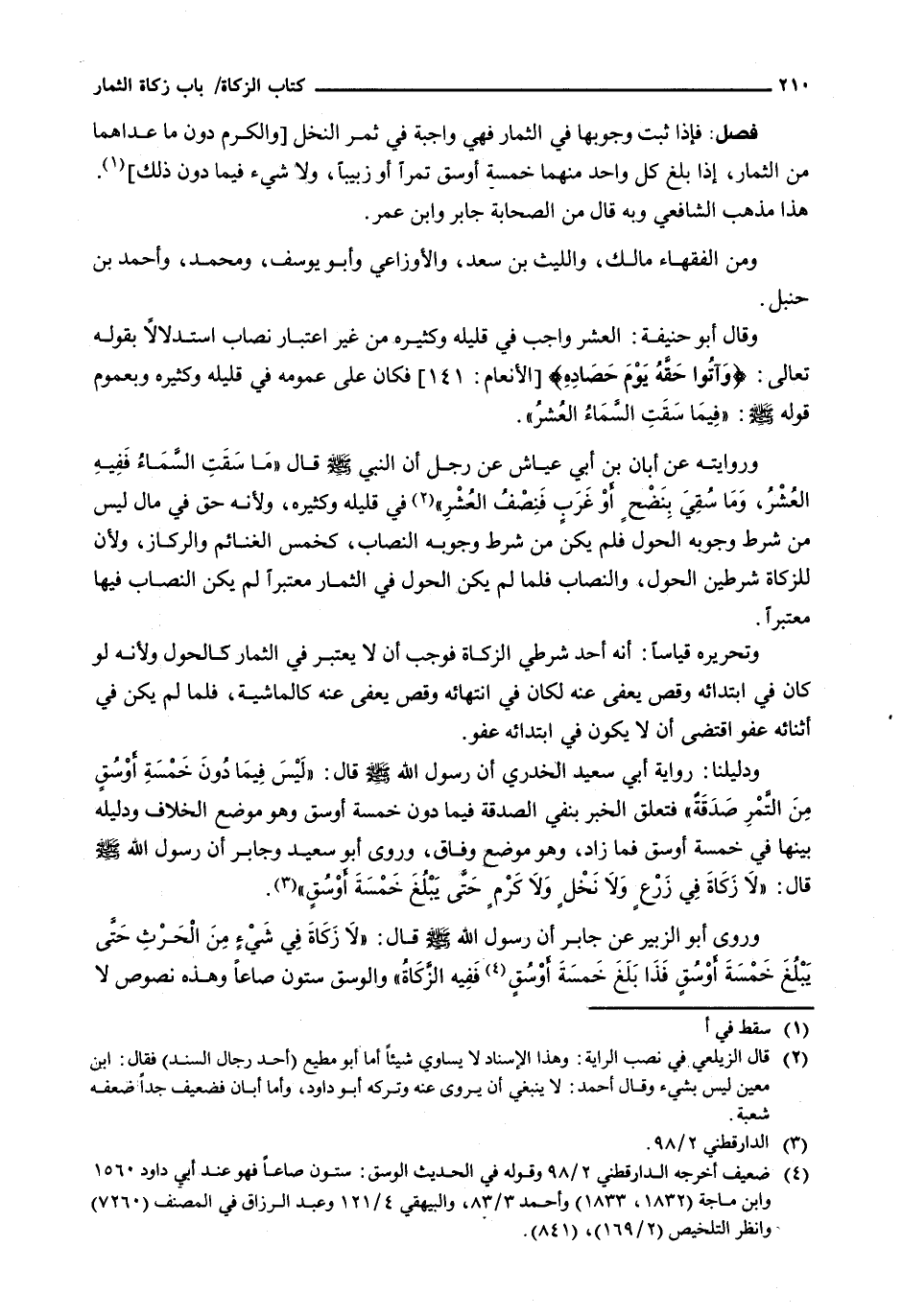 وَرَوَى أَبُو الزُّبَيْرِ عَنْ جَابِرٍ أَنَّ رَسُولَ اللَّهِ - صَلَّى اللَّهُ عَلَيْهِ وَسَلَّم َ - قَالَ: " لَا زَكَاةَ فِي شيءٍ مِنَ الحرثِ حتى يبلغ خمسة أوسقٍ فذا بَلَغَ خَمْسَةَ أوسقٍ فَفِيهِ الزَّكَاةُ " وَالْوَسْقُ سِتُّونَ صَاعًا وَهَذِهِ نُصُوصٌ لَا