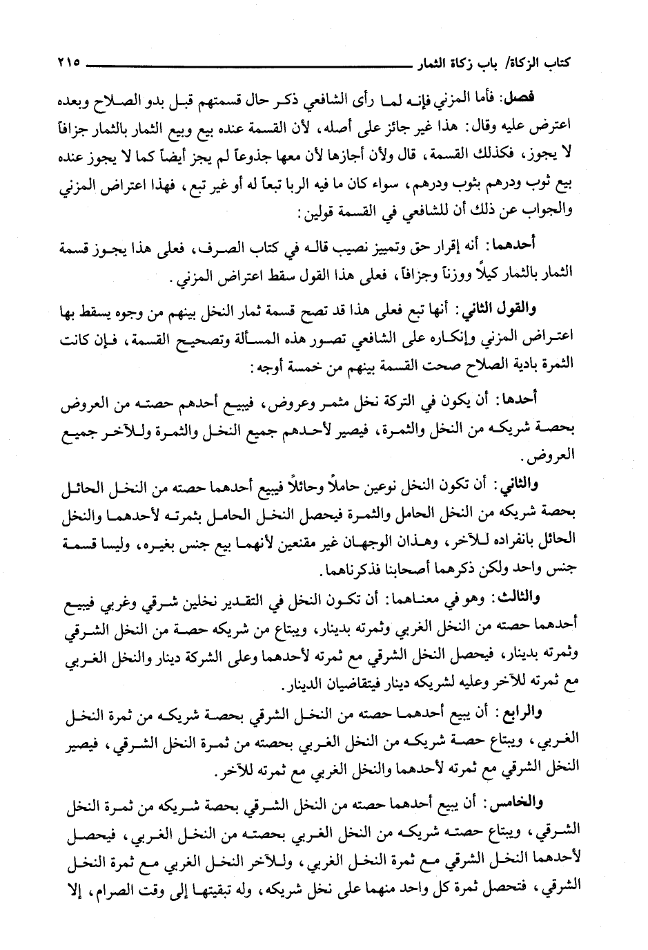 : فَأَمَّا الْمُزَنِيُّ فَإِنَّهُ لَمَّا رَأَى الشَّافِعِيَّ ذَكَرَ حَالَ قِسْمَتِهِمْ قَبْلَ بُدُوِّ الصَّلَاحِ وَبَعْدَهُ اعْتَرَضَ عَلَيْهِ وَقَالَ: هَذَا غَيْرُ جَائِزٍ عَلَى أَصْلِهِ، لِأَنَّ الْقِسْمَةَ عِنْدَهُ بَيْعٌ وَبَيْعُ الثِّمَارِ بِالثِّمَارِ جُزَافًا لَا يَجُوزُ، فَكَذَلِكَ الْقِسْمَةُ، قَالَ ولأن أَجَازَهَا لِأَنَّ مَعَهَا جُذُوعًا لَمْ يَجُزْ أَيْضًا كَمَا لَا يَجُوزُ عِنْدَهُ بَيْعُ ثَوْبٍ وَدِرْهَمٍ بِثَوْبٍ وَدِرْهَمٍ، سَوَاءٌ كَانَ مَا فِيهِ الرِّبَا تَبَعًا لَهُ أَوْ غَيْرَ تَبَعٍ، فَهَذَا اعْتِرَاضُ الْمُزَنِيِّ وَالْجَوَابُ عَنْ ذَلِكَ إِنَّ لِلشَّافِعِيِّ فِي القسمة قولين: