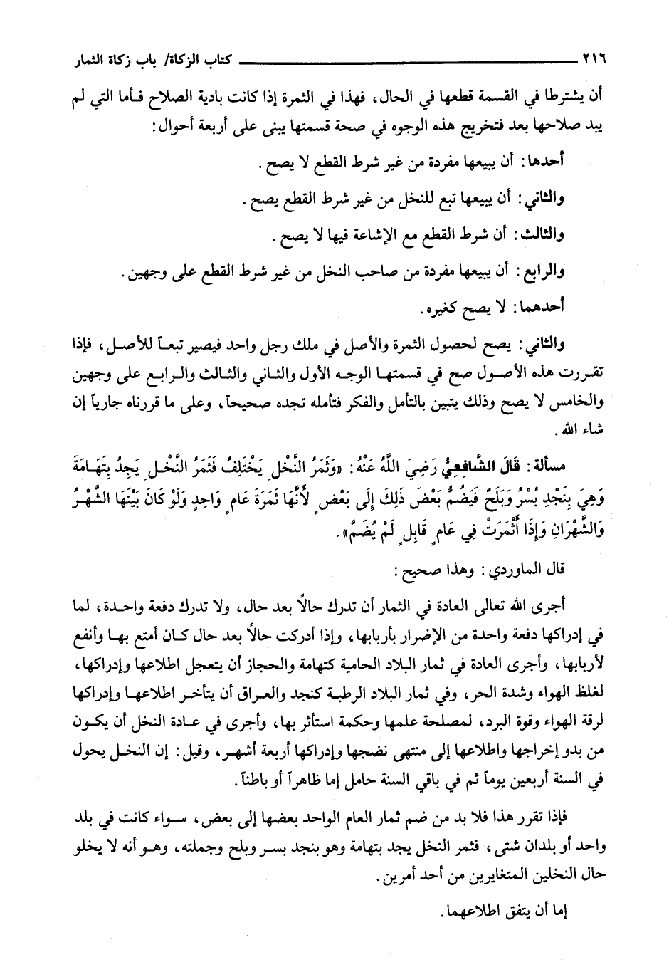 قال الشافعي رضي الله عنه: " وثمر النخل يختلف فَثَمَرُ النَّخْلِ يُجَدُّ بِتِهَامَةَ وَهِيَ بِنَجْدٍ بُسْرٌ وبلح فيضم بعض ذلك إِلَى بَعْضٍ لِأَنَّهَا ثَمَرَةُ عامٍ واحدٍ وَلَوْ كان بينها الشَهْرُ وَالشَّهْرَانِ وَإِذَا أَثْمَرَتْ فِي عَامٍ قَابِلٍ لم يضم ".