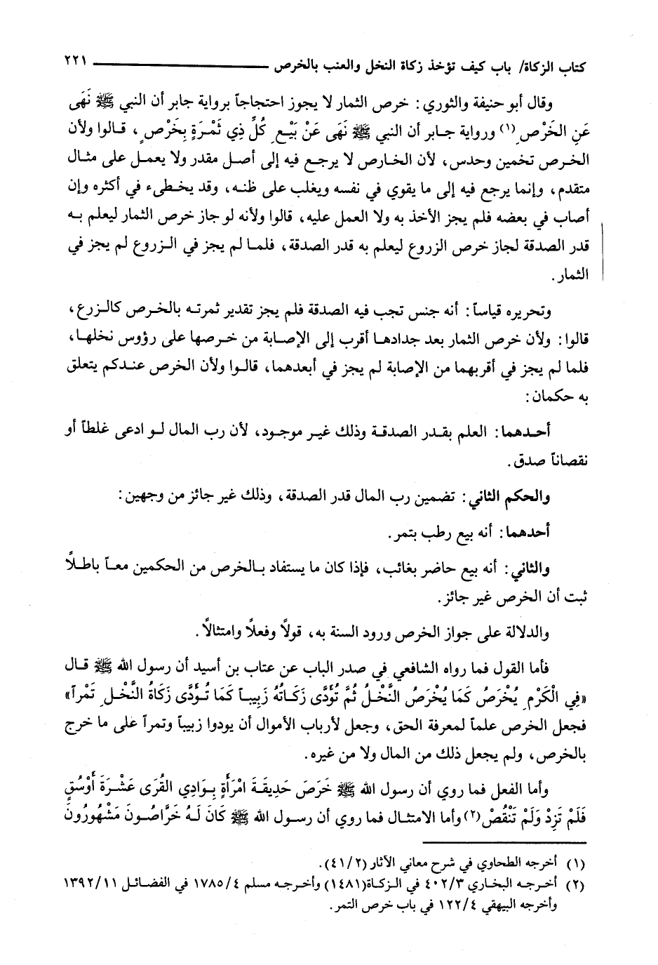فَأَمَّا الْقَوْلُ فيما رَوَاهُ الشَّافِعِيُّ فِي صَدْرِ الْبَابِ عَنْ عَتَّابِ بْنِ أُسَيْدٍ أَنَّ رَسُولَ اللَّهِ - صَلَّى اللَّهُ عَلَيْهِ وَسَلَّم َ - قَالَ " فِي الْكَرْمِ يُخْرَصُ كَمَا يُخْرَصُ النَّخْلُ ثُمَّ تُؤَدَّى زَكَاتُهُ زَبِيبًا كَمَا تُؤَدَّى زَكَاةُ النَخْلِ تَمْرًا " فَجَعَلَ الْخَرْصَ عَلَمًا لِمَعْرِفَةِ الْحَقِّ، وجعل لأرباب الأموال أن يودوا زَبِيبًا وَتَمْرًا عَلَى مَا خَرَجَ بِالْخَرْصِ، وَلَمْ يَجْعَلْ ذَلِكَ مِنَ الْمَالِ وَلَا مِنْ غَيْرِهِ.