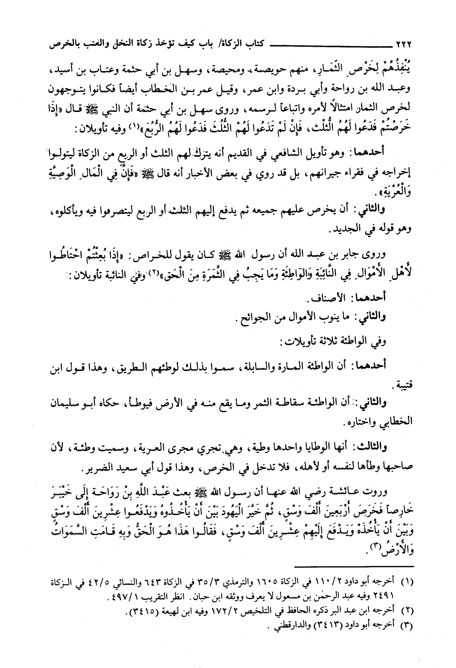 وَرَوَى جَابِرِ بْنِ عَبْدِ اللَّهِ أَنَّ رَسُولَ اللَّهِ - صَلَّى اللَّهُ عَلَيْهِ وَسَلَّم َ - كان يقول للخراص: " إذا بعثتم احْتَاطُوا لِأَهْلِ الْأَمْوَالِ فِي النَّائِبَةِ وَالْوَاطِئَةِ وَمَا يَجِبُ فِي الثَمَرَةِ مِنَ الْحَقِّ " وَفِي النَّائِبَةِ تأويلان: