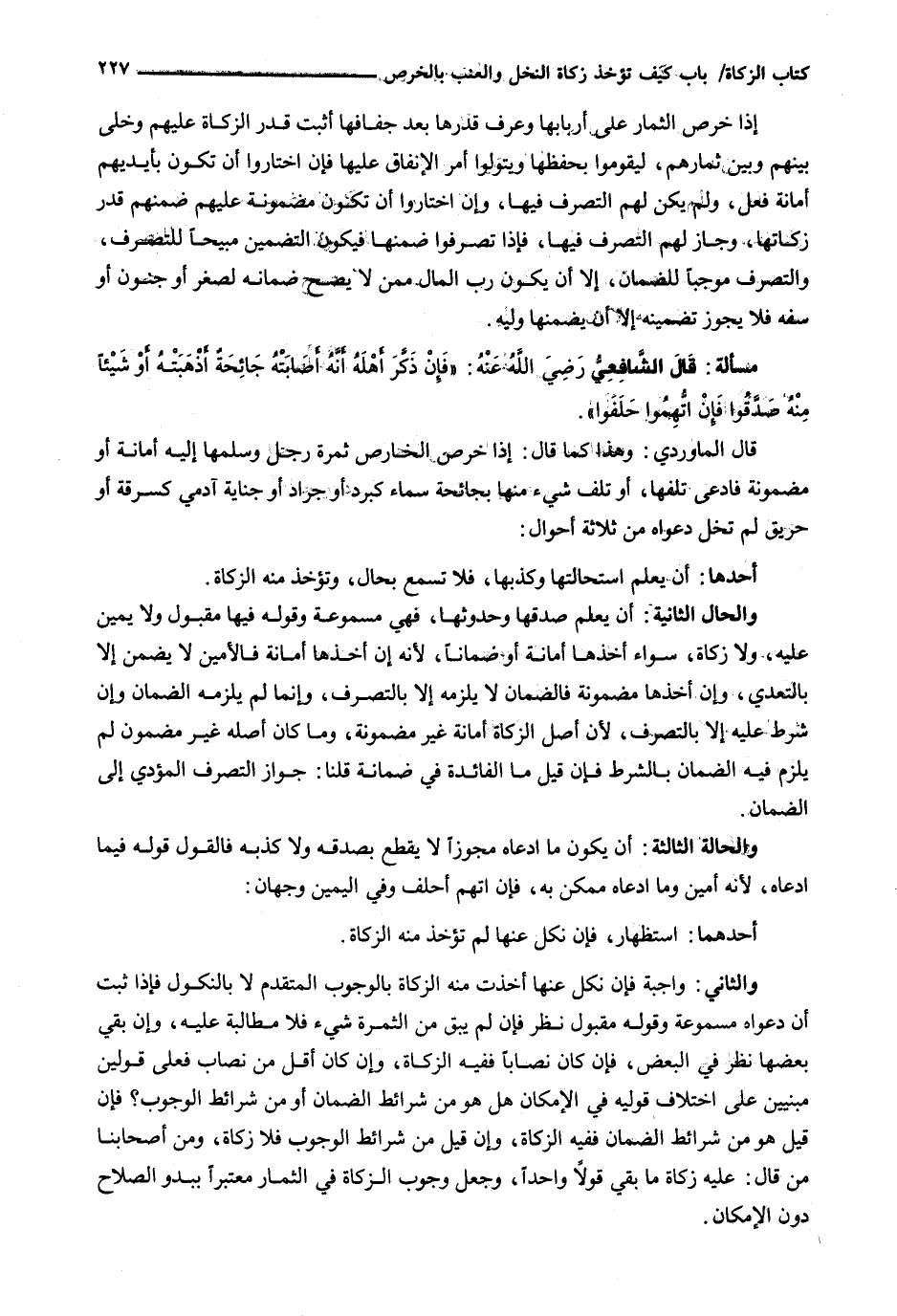 إِذَا خَرَصَ الثِّمَارَ عَلَى أَرْبَابِهَا وَعَرَفَ قَدْرَهَا بَعْدَ جَفَافِهَا أَثْبَتَ قَدْرَ الزَّكَاةِ عَلَيْهِمْ وَخَلَّى بَيْنَهُمْ وَبَيْنَ ثِمَارِهِمْ، لِيَقُومُوا بِحِفْظِهَا وَيَتَوَلَّوْا أَمْرَ الْإِنْفَاقِ عَلَيْهَا فَإِنِ اخْتَارُوا أَنْ تَكُونَ بِأَيْدِيهِمْ أَمَانَةُ فَعَلَ، وَلَمْ يَكُنْ لَهُمُ التَّصَرُّفُ فِيهَا، وَإِنِ اخْتَارُوا أَنْ تَكُونَ مَضْمُونَةً عَلَيْهِمْ ضَمَّنَهُمْ قَدْرَ زَكَاتِهَا، وَجَازَ لَهُمُ التَّصَرُّفُ فِيهَا، فَإِذَا تَصَرَّفُوا ضَمَّنَهَا فَيَكُونُ التَّضْمِينُ مُبِيحًا لِلتَّصَرُّفِ، وَالتَّصَرُّفُ مُوجِبًا لِلضَّمَانِ، إِلَّا أَنْ يَكُونَ رَبُّ الْمَالِ مِمَّنْ لَا يَصِحُّ ضَمَانُهُ لِصِغَرٍ أَوْ جُنُونٍ أَوْ سَفَهٍ فَلَا يَجُوزُ تَضْمِينُهُ إِلَّا أَنْ يضمنها وليه.