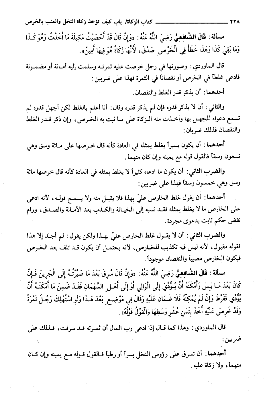قال الشافعي رضي الله عنه: " وَإِنْ قَالَ سُرِقَ بَعْدَ مَا صَيَّرْتُهُ إِلَى الْجَرِينِ فَإِنْ كَانَ بَعْدَ مَا يَبِسَ وَأَمْكَنَهُ أَنْ يُؤَدِّيَ إِلَى الْوَالِي أَوْ إِلَى أَهْلِ السهمان فقد ضمن ما أمكنه أن يؤدي ففرط وإن لم يمكنه فلا ضمان عليه وقال في موضع بعد هذا ولو استهلك رجل ثمرة وقد خرص عليه أخذ بثمن عشر وسطها والقول قَوْلِهِ ".