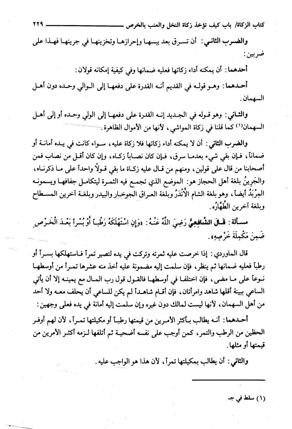 وَالضَّرْبُ الثَّانِي: أَنْ لَا يُمْكِنَهُ أَدَاءُ زَكَاتِهَا فَلَا زَكَاةَ عَلَيْهِ، سَوَاءٌ كَانَتْ فِي يَدِهِ أمانة أو ضماناً، فإن بقي شيء بعدما سُرِقَ، فَإِنْ كَانَ نِصَابًا زَكَّاهُ، وَإِنْ كَانَ أَقَلَّ مِنْ نِصَابٍ فَمِنْ أَصْحَابِنَا مَنْ قَالَ عَلَى قَوْلَيْنِ، وَمِنْهُمْ مَنْ قَالَ عَلَيْهِ زَكَاةُ مَا بَقِيَ قَوْلًا وَاحِدًا عَلَى مَا ذَكَرْنَاهُ، وَالْجَرِينُ بِلُغَةِ أَهْلِ الْحِجَازِ هُوَ: الْمَوْضِعُ الَّذِي تُجْمَعُ فِيهِ الثَّمَرَةُ لِيَتَكَامَلَ جَفَافُهَا وَيُسَمُّونَهُ الْمِرْبَدَ أَيْضًا، وَهُوَ بِلُغَةِ الشَّامِ الْأَنْدُرُ وَبِلُغَةِ الْعِرَاقِ الجوخار والبيدر وبلغة آخرين المسطاح وبلغة آخرين الطهارة