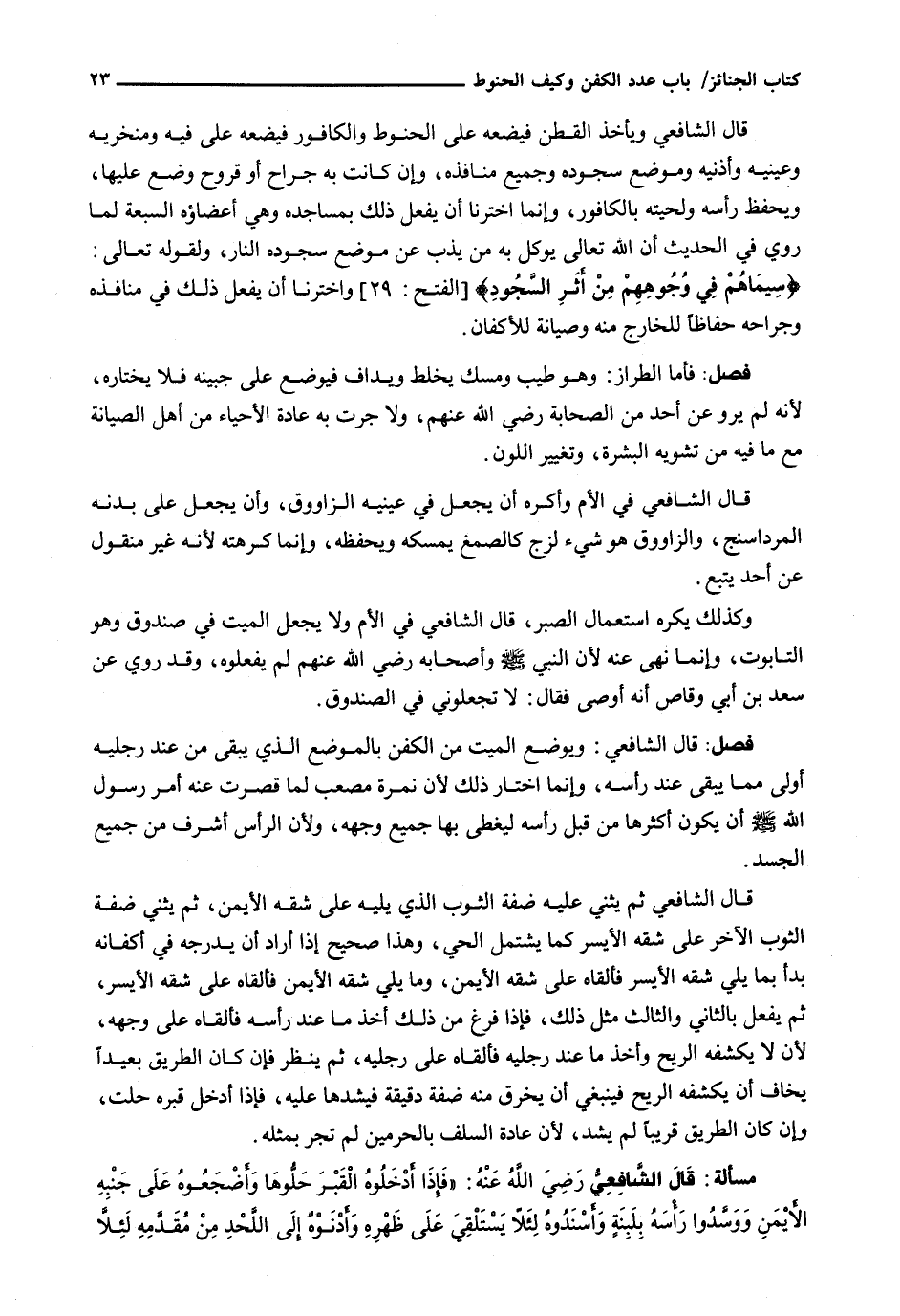 قَالَ الشَّافِعِيُّ وَيَأْخُذُ الْقُطْنَ فَيَضَعُهُ عَلَى الْحَنُوطِ وَالْكَافُورِ فَيَضَعُهُ عَلَى فِيهِ وَمَنْخَرَيْهِ وَعَيْنَيْهِ وَأُذُنَيْهِ وَمَوْضِعِ سُجُودِهِ وَجَمِيعِ مَنَافِذِهِ، وَإِنْ كَانَتْ بِهِ جِرَاحٌ أَوْ قُرُوحٌ وَضَعَ عَلَيْهَا، وَيَحْفَظُ رَأْسَهُ وَلِحْيَتَهُ بِالْكَافُورِ، وَإِنَّمَا اخْتَرْنَا أَنْ يَفْعَلَ ذَلِكَ بِمَسَاجِدِهِ وَهِيَ أَعْضَاؤُهُ السَّبْعَةُ لِمَا رُوِيَ فِي الْحَدِيثِ أَنَّ اللَّهَ تَعَالَى يُوكِلُ بِهِ مَنْ يَذُبُّ عَنْ مَوْضِعِ سُجُودِهِ النَّارَ، وَلِقَوْلِهِ تَعَالَى: {سِيمَاهُمْ فِي وُجُوهِهِمْ مِنْ أثَرِ السّجُودِ) {الفتح: 29) وَاخْتَرْنَا أَنْ يَفْعَلَ ذَلِكَ فِي مَنَافِذِهِ وَجِرَاحِهِ حِفَاظًا لِلْخَارِجِ مِنْهُ وَصِيَانَةً لِلْأَكْفَانِ.