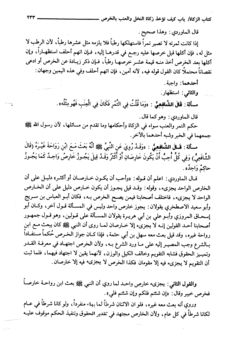 قَالَ الْمَاوَرْدِيُّ: اعْلَمْ أَنَّ قَوْلَهُ: " وَأُحِبُّ أَنْ يَكُونَ خَارِصَانِ أَوْ أَكْثَرُ " دَلِيلٌ عَلَى أَنَّ الْخَارِصَ الْوَاحِدَ يُجْزِئُ، وَقَوْلُهُ: وَقَدْ قيل يجوز أن يكون خارص دليل على أن الْخَارِصَ الْوَاحِدَ لَا يُجْزِئُ، فَاخْتَلَفَ أَصْحَابُنَا فِيمَنْ يَصِحُّ الْخَرْصُ بِهِ، فَكَانَ أَبُو الْعَبَّاسِ بْنُ سُرَيْجٍ وَأَبُو سَعِيدٍ الْإِصْطَخْرِيُّ يَقُولَانِ: يَجُوزُ خَارِصٌ وَاحِدٌ وَلَيْسَ فِي الْمَسْأَلَةِ قَوْلٌ آخَرُ، وَكَانَ أَبُو إِسْحَاقَ الْمَرْوَزِيُّ وَأَبُو عَلِيِّ بْنُ أَبِي هُرَيْرَةَ يَقُولَانِ الْمَسْأَلَةُ عَلَى قَوْلَيْنِ، وَهُوَ قَوْلُ جُمْهُورِ أَصْحَابِنَا أَحَدُ الْقَوْلَيْنِ أَنَّهُ لَا يُجْزِئُ إِلَّا خَارِصَانِ لِمَا رُوِيَ أَنَّ النَّبِيَّ - صَلَّى اللَّهُ عَلَيْهِ وَسَلَّم َ - كَانَ يَبْعَثُ مَعَ ابْنِ رَوَاحَةَ غَيْرَهُ، وَقَدْ قِيلَ بَعَثَ مَعَهُ سَهْلَ بْنَ أَبِي حَثْمَةَ، فَإِذَا كَانَ جَوَازُ الْخَرْصِ حُكْمًا مُسْتَفَادًا بِالشَّرْعِ وَجَبَ الْمَصِيرُ إِلَيْهِ عَلَى مَا وَرَدَ الشَّرْعُ بِهِ، وَلِأَنَّ الْخَرْصَ اجْتِهَادٌ فِي مَعْرِفَةِ الْقَدْرِ وَتَمْيِيزِ الْحُقُوقِ فَشَابَهَ التَّقْوِيمَ وَخَالَفَ الْكَيْلَ وَالْوَزْنَ، لِأَنَّهُمَا يَقِينٌ لَا اجْتِهَادَ فِيهِمَا، فَلَمَّا ثَبَتَ أن التقويم لا يجزئ فيه إلا مقومان فكذا الْخَرْصُ لَا يُجْزِئُ فِيهِ إِلَّا خَارِصَانِ.