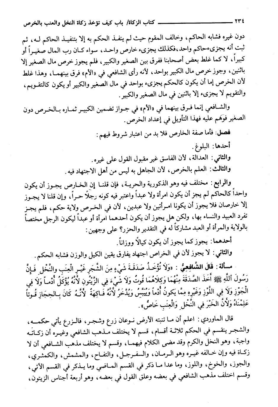 قَالَ الْمَاوَرْدِيُّ: اعْلَمْ أَنَّ مَا تُنْبِتُهُ الْأَرْضُ نَوْعَانِ زَرْعٌ وَشَجَرٌ، فَالزَّرْعُ يَأْتِي حُكْمُهُ، وَالشَّجَرُ يَنْقَسِمُ فِي الْحُكْمِ ثَلَاثَةَ أَقْسَامٍ، قِسْمٌ لَا يَخْتَلِفُ مَذْهَبُ الشَّافِعِيِّ وَغَيْرُهُ أَنَّ زَكَاتَهُ وَاجِبَةٌ، وَهُوَ النَّخْلُ وَالْكَرْمُ وَقَدْ مَضَى الْكَلَامُ فِيهِمَا، وَقِسْمٌ لَا يَخْتَلِفُ مَذْهَبُ الشَّافِعِيِّ أَنْ لَا زَكَاةَ فِيهِ وَإِنْ خَالَفَهُ غَيْرُهُ وَهُوَ الرُّمَّانُ، وَالسَّفَرْجَلُ، وَالتِّفَّاحُ، وَالْمِشْمِشُ، وَالْكُمَّثْري، وَالْجَوْزُ، وَالْخَوْخُ، وَاللَّوْزُ، وَمَا عَدَا مَا ذُكِرَ فِي الْقِسْمِ الْمَاضِي وَمَا يُذْكَرُ فِي الْقِسْمِ الْآتِي، وَقِسْمٌ اخْتَلَفَ مَذْهَبُ الشَّافِعِيِّ فِي بَعْضِهِ وَعَلَّقَ الْقَوْلَ فِي بَعْضِهِ، وَهُوَ أَرْبَعَةُ أَجْنَاسٍ الزَّيْتُونُ،