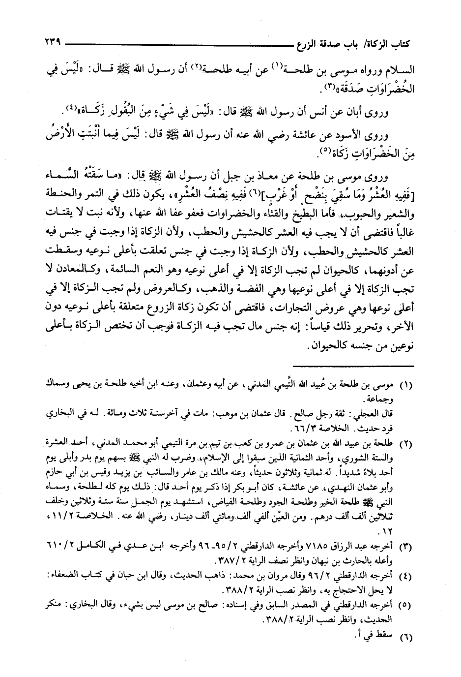 السَّلَامُ وَرَوَاهُ مُوسَى بْنُ طَلْحَةَ عَنْ أَبِيهِ طَلْحَةَ أَنَّ رَسُولَ اللَّهِ - صَلَّى اللَّهُ عَلَيْهِ وَسَلَّم َ - قَالَ: " لَيْسَ فِي الْخَضْرَاوَاتِ صَدَقَةٌ ".