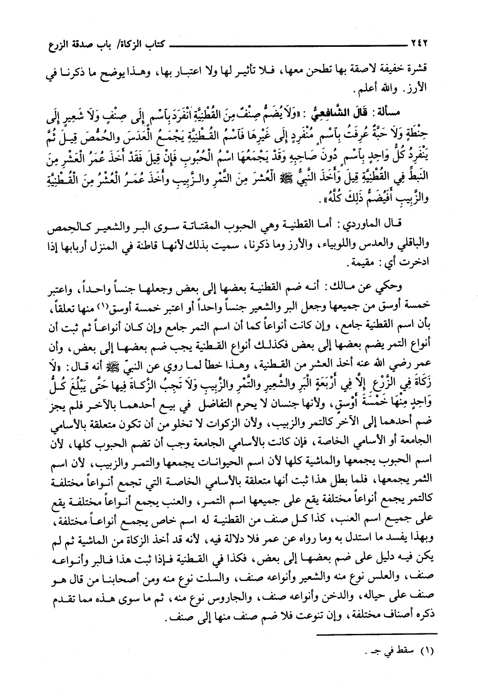 قال الشافعي: " وَلَا يُضَمُّ صِنْفٌ مِنَ الْقَطْنِيَّةِ انْفَرَدَ بِاسْمٍ إِلَى صِنْفٍ وَلَا شَعِيرٌ إِلَى حنطةٍ وَلَا حبةٌ عرفت باسم منفرد إلى غيرها فاسم القطنية يجمع العدس والحمص قيل ثم ينفرد كل واحد باسم دون صاحبه وقد يجمعها اسم الحبوب فإن قيل فقد أخذ عمر العشر من النبط في القطنية قيل وأخذ النبي - صَلَّى اللَّهُ عَلَيْهِ وَسَلَّم َ - العشر من التمر والزبيب وأخذ عمر العشر من القطنية والزبيب أفيضم ذلك كله ".