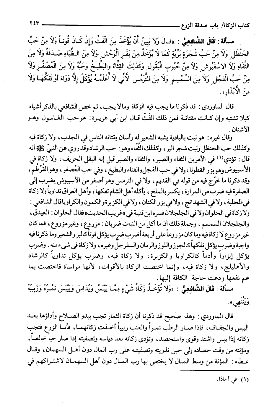 وَقَالَ غَيْرُهُ: هُوَ نَبْتٌ بِالْبَادِيَةِ يُشْبِهُ الشَّعِيرَ لَهُ رَأْسَانِ يَقْتَاتُهُ النَّاسُ فِي الْجَدبِ، وَلَا زَكَاةَ فِيهِ وَكَذَلِكَ حَبُّ الْحَنْظَلِ ونبت شجر البر، وكذلك الثفاء وَهُوَ: حَبُّ الرَّشَادِ وَقَدْ رُوِيَ عَنِ النَّبِيِّ - صَلَّى اللَّهُ عَلَيْهِ وَسَلَّم َ - أنه قال: تؤدي في الأمرين الثفاء والصبر، والثفاء والصبر قيل إنه البقل الحريف، ولا زكاة في الأسبيوش وهو بزر القطونا، ولا في حب الفجل والقثاء والبطيخ، وفي حَبِّ الْعُصْفُرِ، وَهُوَ الْقرْطمُ، وَقَدْ ذَكَرْنَا مَا خَرَّجَ فِيهِ مِنْ قَوْلِهِ فِي الْقَدِيمِ، وَلَا في الترمس وهو أصغر من الأسبيوش يَضْرِبُ إِلَى الصُّفْرَةِ فِيهِ ضَرْبٌ مِنَ الْمَرَارَةِ، يُكْسَرُ بِالْمِلْحِ، يَأْكُلُهُ أَهْلُ الشَّامِ تَفُكُّهًا، وَأَهْلُ الْعِرَاقِ تَدَاوِيًا وَلَا زَكَاةَ فِي الْحُلْبَةِ، وَلَا في الشهدانج، وَلَا فِي بَزْرِ الْكِتَّانِ، وَلَا فِي الْكُزْبَرَةِ وَالْكَمُّونِ وَالْكَرَاويَا قَالَ الشَّافِعِيُّ: وَلَا زَكَاةَ فِي الْحُلْوَانِ وَلَا فِي الْجُلْجُلَانِ فَسَّرَهُ ابْنُ قُتَيْبَةَ في " غريب الحديث " فقال الحلوان: العيدق، وَالْجُلْجُلَانُ السِّمْسِمُ، وَجُمْلَةُ ذَلِكَ أَنَّ مَا أُكِلَ مِنَ النَّبَاتِ ضَرْبَانِ: مَزْرُوعٌ، وَغَيْرُ مَزْرُوعٍ، فَمَا كَانَ غَيْرَ مَزْرُوعٍ لَا زَكَاةَ فِيهِ وَمَا كَانَ مَزْرُوعًا عَلَى أَرْبَعَةِ أَضْرُبٍ ضَرْبٌ يُؤْكَلُ قوتاً كالبر والشعير وما ذكرنا فِيهِ وَاجِبَةٌ وَضَرْبٌ يُؤْكَلُ تَفَكُّهًا كَالْجَوْزِ وَاللَّوْزِ وَالرُّمَّانِ وَالسَّفَرْجَلِ وَغَيْرِهِ، وَلَا زَكَاةَ فِي شَيْءٍ مِنْهُ، وَضَرْبٌ يُؤْكَلُ أبْزَارًا وَأُدْمًا كَالْكَرَاويَا وَالْكُزْبَرَةِ، وَلَا زَكَاةَ فِيهِ، وَضَرْبٌ يُؤْكَلُ تَدَاوِيًا كَالرَّشَادِ وَالْإِهْلِيلَجِ، وَلَا زَكَاةَ فِيهِ، وَإِنَّمَا اخْتَصَّتِ الزَّكَاةُ بِالْأَقْوَاتِ، لِأَنَّهَا مُوَاسَاةٌ فَاخْتَصَّتْ بِمَا عَمَّ نَفْعُهَا ودعت حاجة الكافة إليها.