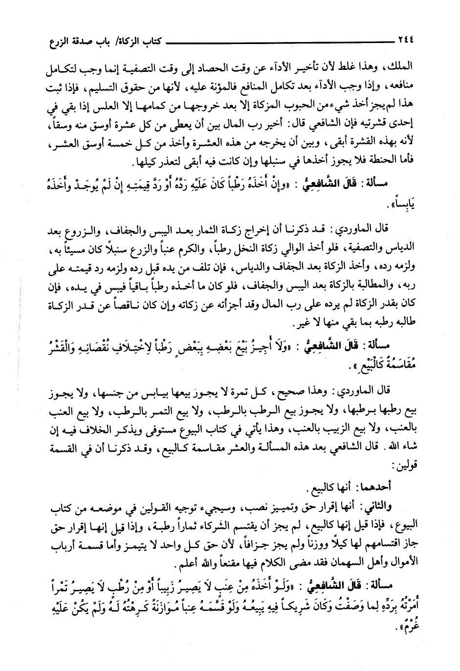 قال الماوردي: وهذا صحيح، كل تمرة لَا يَجُوزُ بَيْعُهَا بِيَابِسٍ مِنْ جِنْسِهَا، وَلَا يَجُوزُ بَيْعُ رُطَبِهَا بِرُطَبِهَا، وَلَا يَجُوزُ بَيْعُ الرُّطَبِ بِالرُّطَبِ، وَلَا بَيْعُ التَّمْرِ بِالرُّطَبِ، وَلَا بَيْعُ الْعِنَبِ بِالْعِنَبِ، وَلَا بَيْعُ الزَّبِيبِ بِالْعِنَبِ، وهذا يأتي في كتاب البيوع مستوفى ويذكر الْخِلَافَ فِيهِ إِنْ شَاءَ اللَّهُ. قَالَ الشَّافِعِيُّ بَعْدَ هَذِهِ الْمَسْأَلَةِ وَالْعُشْرُ مُقَاسَمَةٌ كَالْبَيْعِ، وَقَدْ ذَكَرْنَا أَنَّ فِي الْقِسْمَةِ قَوْلَيْنِ:
