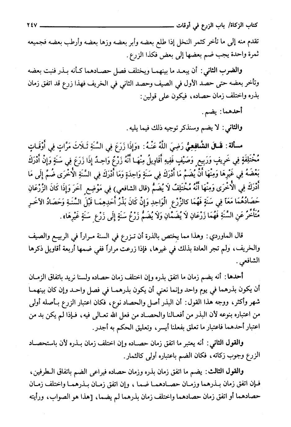 قَالَ الْمَاوَرْدِيُّ: وَهَذَا مِمَّا يَخْتَصُّ بِالذُّرَةِ أَنْ تُزْرَعَ فِي السَّنَةِ مِرَارًا فِي الرَّبِيعِ وَالصَّيْفِ وَالْخَرِيفِ، وَلَمْ تَجْرِ الْعَادَةُ بِذَلِكَ فِي غَيْرِهَا، فَإِذَا زُرِعَتْ مِرَارًا فَفِي ضَمِّهَا أَرْبَعَةُ أَقَاوِيلَ ذَكَرَهَا الشَّافِعِيُّ.