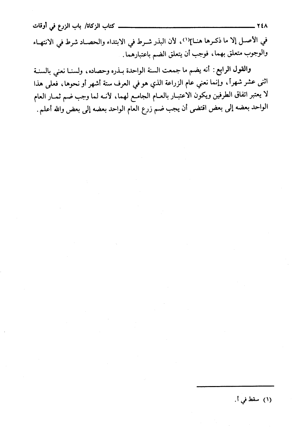 وَالْقَوْلُ الرَّابِعُ: إِنَّهُ يُضَمُّ مَا جَمَعَتِ السَّنَةُ الْوَاحِدَةُ بَذْرَهُ وَحَصَادَهُ، وَلَسْنَا نَعْنِي بِالسَّنَةِ اثْنَيْ عَشَرَ شَهْرًا، وَإِنَّمَا نَعْنِي عَامَ الزِّرَاعَةِ الَّذِي هُوَ فِي الْعُرْفِ سِتَّةُ أَشْهُرٍ أَوْ نَحْوُهَا، فَعَلَى هَذَا لَا يُعْتَبَرُ اتِّفَاقُ الطَّرَفَيْنِ وَيَكُونُ الِاعْتِبَارُ بِالْعَامِ الْجَامِعِ لَهُمَا، لِأَنَّهُ لَمَّا وَجَبَ ضَمُّ ثِمَارِ الْعَامِ الْوَاحِدِ بَعْضِهِ إِلَى بَعْضٍ اقْتَضَى أَنْ يَجِبَ ضَمُّ زَرْعِ الْعَامِ الْوَاحِدِ بَعْضِهِ إِلَى بَعْضٍ والله أعلم.