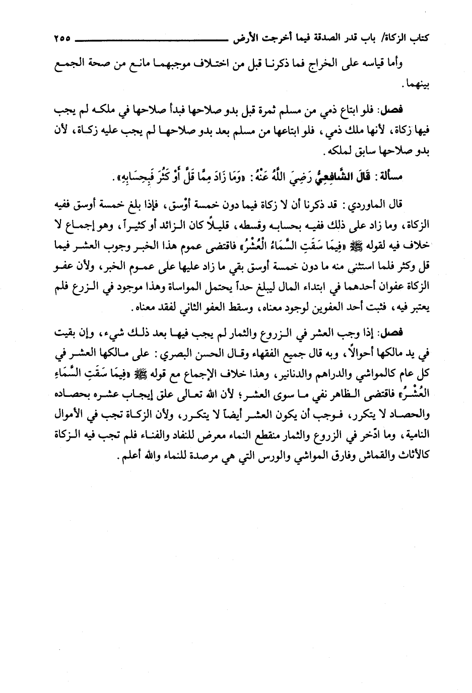 قَالَ الْمَاوَرْدِيُّ: قَدْ ذَكَرْنَا أَنْ لَا زَكَاةَ فِيمَا دُونَ خَمْسَةِ أَوْسُقٍ، فَإِذَا بَلَغَ خَمْسَةَ أَوْسُقٍ فَفِيهِ الزَّكَاةُ، وَمَا زَادَ عَلَى ذَلِكَ فَفِيهِ بِحِسَابِهِ وَقِسْطِهِ، قَلِيلًا كَانَ الزَّائِدُ أَوْ كَثِيرًا، وَهُوَ إِجْمَاعٌ لَا خِلَافَ فِيهِ لِقَوْلِهِ - صَلَّى اللَّهُ عَلَيْهِ وَسَلَّم َ - " فِيمَا سَقَتِ السَّمَاءُ الْعُشْرَ " فَاقْتَضَى عُمُومُ هَذَا الْخَبَرِ وُجُوبَ الْعُشْرِ فِيمَا قَلَّ وَكَثُرَ فَلَمَّا اسْتَثْنَى مِنْهُ مَا دُونَ خَمْسَةِ أَوْسُقٍ بَقِيَ مَا زَادَ عَلَيْهَا عَلَى عُمُومِ الْخَبَرِ، وَلِأَنَّ عَفْوَ الزَّكَاةِ عَفْوَانِ أَحَدُهُمَا فِي ابْتِدَاءِ الْمَالِ لِيَبْلُغَ حَدًّا يَحْتَمِلُ الْمُوَاسَاةَ وَهَذَا مَوْجُودٌ فِي الزَّرْعِ فَلَمْ يُعْتَبَرْ فِيهِ، فَثَبَتَ أَحَدُ الْعَفْوَيْنِ لِوُجُودِ مَعْنَاهُ، وَسَقَطَ الْعَفْوُ الثَّانِي لِفَقْدِ مَعْنَاهُ.