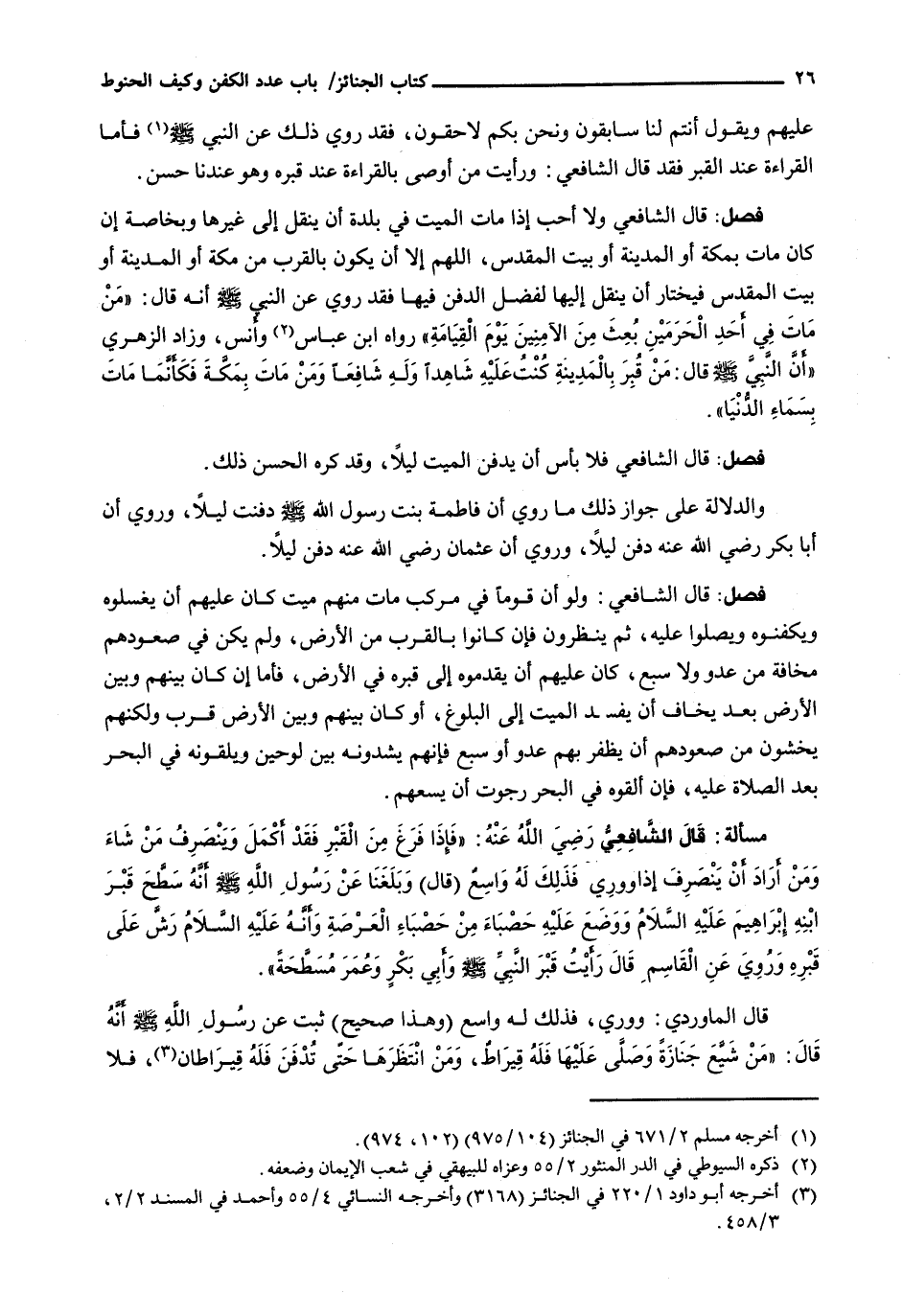 قَالَ الشَّافِعِيُّ وَلَا أُحِبُّ إِذَا مَاتَ الْمَيِّتُ فِي بَلْدَةٍ أَنْ يُنْقَلَ إِلَى غَيْرِهَا وَبِخَاصَّةٍ إِنْ كَانَ مَاتَ بِمَكَّةَ أَوِ الْمَدِينَةِ أَوْ بَيْتِ الْمَقْدِسِ، اللَّهُمَّ إِلَّا أَنْ يَكُونَ بِالْقُرْبِ مِنْ مَكَّةَ أَوِ الْمَدِينَةِ أَوْ بَيْتِ الْمَقْدِسِ فَيَخْتَارُ أَنْ يُنْقَلَ إِلَيْهَا لِفَضْلِ الدَّفْنِ فِيهَا فَقَدْ رُوِيَ عَنِ النَّبِيِّ - صَلَّى اللَّهُ عَلَيْهِ وَسَلَّم َ - أَنَّهُ قَالَ: " مَنْ مَاتَ فِي أَحَدِ الْحَرَمَيْنِ بُعِثَ مِنَ الْآمِنِينَ يَوْمَ الْقِيَامَةِ " رَوَاهُ ابْنُ عَبَّاسٍ وَأَنَسٌ، وَزَادَ الزُّهْرِيُّ " أَنَّ النَّبِيَّ - صَلَّى اللَّهُ عَلَيْهِ وَسَلَّم َ - قَالَ: مَنْ قُبِرَ بِالْمَدِينَةِ كُنْتُ عَلَيْهِ شَاهِدًا وَلَهِ شَافِعًا وَمَنْ مَاتَ بِمَكَّةَ فَكَأَنَّمَا مَاتَ بِسَمَاءِ الدُّنْيَا ".