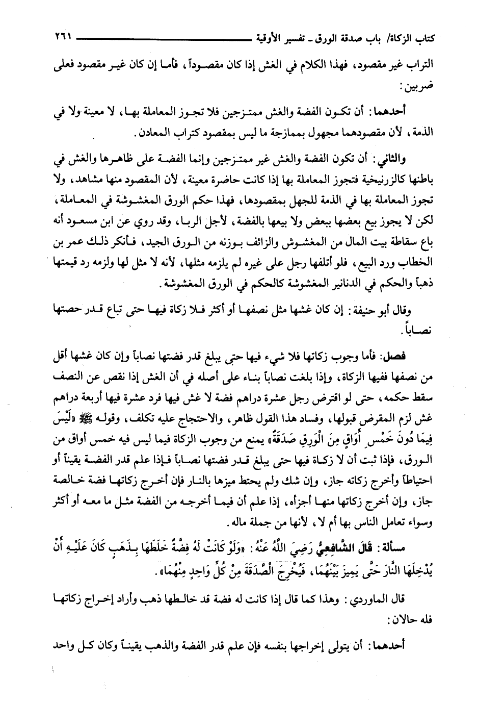 قال الشافعي رضي الله عنه: " وَلَوْ كَانَتْ لَهُ فِضَّةٌ خَلَطَهَا بِذَهَبٍ كَانَ عَلَيْهِ أَنْ يُدْخِلَهَا النَّارَ حَتَى يَمِيزَ بَيْنَهُمَا، فَيُخْرِجَ الصَّدَقَةَ مِنْ كُلِّ واحدْ مِنْهُمَا ".