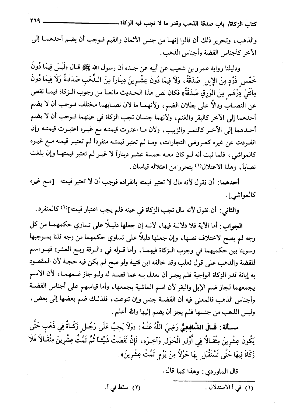 وَدَلِيلُنَا رِوَايَةُ عَمْرِو بْنِ شُعَيْبٍ عَنْ أَبِيهِ عَنْ جَدِّهِ أَنَّ رَسُولَ اللَّهِ - صَلَّى اللَّهُ عَلَيْهِ وَسَلَّم َ - قال " ليس فيما دون خمسٍ ذودٍ من الْإِبِلِ صدقةٌ، وَلَا فِيمَا دُونَ عِشْرِينَ دِينَارًا مِنَ الذَّهَبِ صدقةٌ وَلَا فِيمَا دُونَ مِائَتَيْ درهمٍ مِنَ الورقِ صدقةٌ " فَكَانَ نَصُّ هَذَا الْحَدِيثِ مَانِعًا مِنْ وُجُوبِ الزَّكَاةِ فِيمَا نَقَصَ عَنِ النِّصَابِ وَدَالًّا عَلَى بُطْلَانِ الضَّمِّ، وَلِأَنَّهُمَا ما لان نِصَابُهُمَا مُخْتَلِفٌ فَوَجَبَ أَنْ لَا يُضَمَّ أَحَدُهُمَا إِلَى الْآخَرِ كَالْبَقَرِ وَالْغَنَمِ، وَلِأَنَّهُمَا جِنْسَانِ تَجِبُ الزَّكَاةُ فِي عَيْنِهِمَا فَوَجَبَ أَنْ لَا يُضَمَّ أَحَدُهُمَا إِلَى الْآخَرِ كَالتَّمْرِ وَالزَّبِيبِ، وَلِأَنَّ مَا اعْتُبِرَتْ قِيمَتُهُ مَعَ غَيْرِهِ اعْتُبِرَتْ قِيمَتُهُ وَإِنِ انْفَرَدَتْ عَنْ غَيْرِهِ كَعُرُوضِ التِّجَارَاتِ، وَمَا لَمْ تُعْتَبَرْ قِيمَتُهُ مُنْفَرِدًا لَمْ تُعْتَبَرْ قِيمَتُهُ مَعَ غَيْرِهِ كَالْمَوَاشِي، فَلَمَّا ثَبَتَ أَنَّهُ لَوْ كَانَ مَعَهُ خَمْسَةَ عَشَرَ دِينَارًا لَا غَيْرَ لَمْ تعتبر قيمتها وإن بلغت نصاباً، وهذا الاعتلال يَتَحَرَّرُ مِنِ اعْتِلَالِهِ قِيَاسَانِ.
