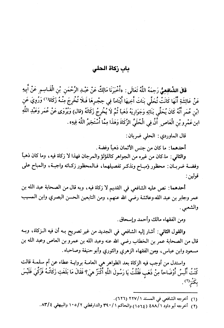 قال الشافعي رحمه الله تعالى: " أَخْبَرَنَا مالكٌ عَنْ عَبْدِ الرَّحْمَنِ بْنِ الْقَاسِمِ عَنْ أبيه عن عائشة أنَهَا كَانَتْ تُحَلِّي بَنَاتَ أَخِيهَا أَيْتَامًا فِي حجرها فلا تخرج منه زكاة وروي عن ابن عمر أنه كان يحلي بناته وجواربه ذهباً ثم لا يخرج زكاته (قال) ويروى عن عمر وعبد الله ابن عمرو بن العاص أن في الحلي الزكاة وَهَذَا مِمَّا أَسْتَخِيرُ اللَّهَ فِيهِ ".