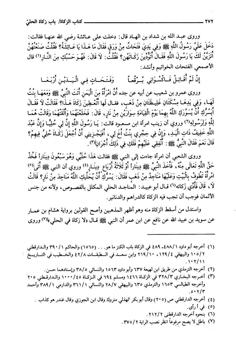 وَرَوَى عَمْرُو بْنُ شُعَيْبٍ عَنْ أَبِيهِ عَنْ جَدِّهِ أَنَّ امْرَأَةً مِنَ الْيَمَنِ أَتَتِ النَّبِيَّ - صَلَّى اللَّهُ عَلَيْهِ وَسَلَّم َ - ومعها بنت لها، وفي يدها مسكتان غليظتان مِنْ ذهبٍ، فَقَالَ لَهَا أَتُعْطِينَ زَكَاةَ هَذَا؟ فَقَالَتْ لَا فَقَالَ أَيَسُرُّكِ أَنْ يُسَوِّرَكِ اللَّهُ بِهِمَا يَوْمَ الْقِيَامَةِ سِوَارَيْنِ مِنْ نارٍ، قَالَ: فَخَلَعَتْهُمَا وَأَلْقَتْهُمَا وَقَالَتْ هُمَا لِلَّهِ وَلِرَسُولِهِ وَرُوِيَ أَنَّ زَيْنَبَ امْرَأَةَ ابْنِ مَسْعُودٍ قَالَتْ: يَا رَسُولَ اللَّهِ إِنَّ لِي حُلِيًّا وَإِنَّ عَبْدَ اللَّهِ خَفِيفُ ذَاتِ الْيَدِ، وَإِنْ فِي حِجْرِي بنت أخٍ لِي، أَفَيَجْزِينِي أَنْ أَجْعَلَ زَكَاةَ حُلِيِّ فيهم قال نعم فقال النبي - صَلَّى اللَّهُ عَلَيْهِ وَسَلَّم َ -: أَنْفِقِي عَلَيْهِمْ فَلَكِ فِي ذَلِكَ أَجْرَانِ.
